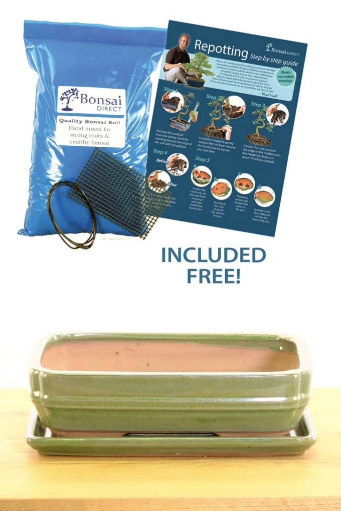 To ensure your bonsai’s successful repotting, we offer a complete package that includes a matching drip tray, essential potting accessories, bonsai soil, wire, and mesh. With these free added extras, you’ll have everything you need for a hassle-free repotting process, providing your bonsai with the best care you can.
