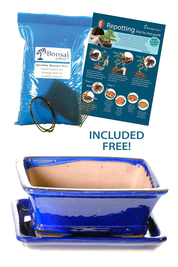 Our premium bonsai pot packages come with everything you need for successful repotting. Each kit includes a detailed repotting guide, mesh for covering drainage holes, wire for securing the tree, a chopstick for working in the soil, and soil for the root ball. These essentials are provided at no extra cost to ensure your repotting experience is smooth and successful.Finally, for a visual guide on how to repot or root prune your bonsai, including preparing the pot, check out the short video below. We hope it proves to be a valuable resource on your bonsai care journey.