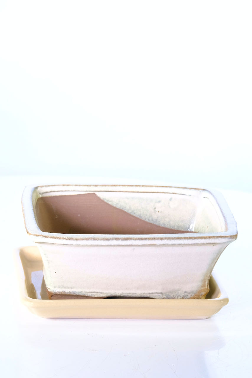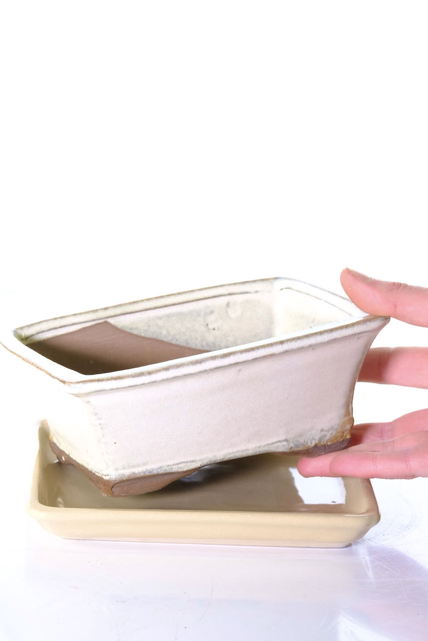 Elegant 7 Inch / 18cm Ceramic Bonsai Pot with Coordinating Ceramic Tray in Soft Cream