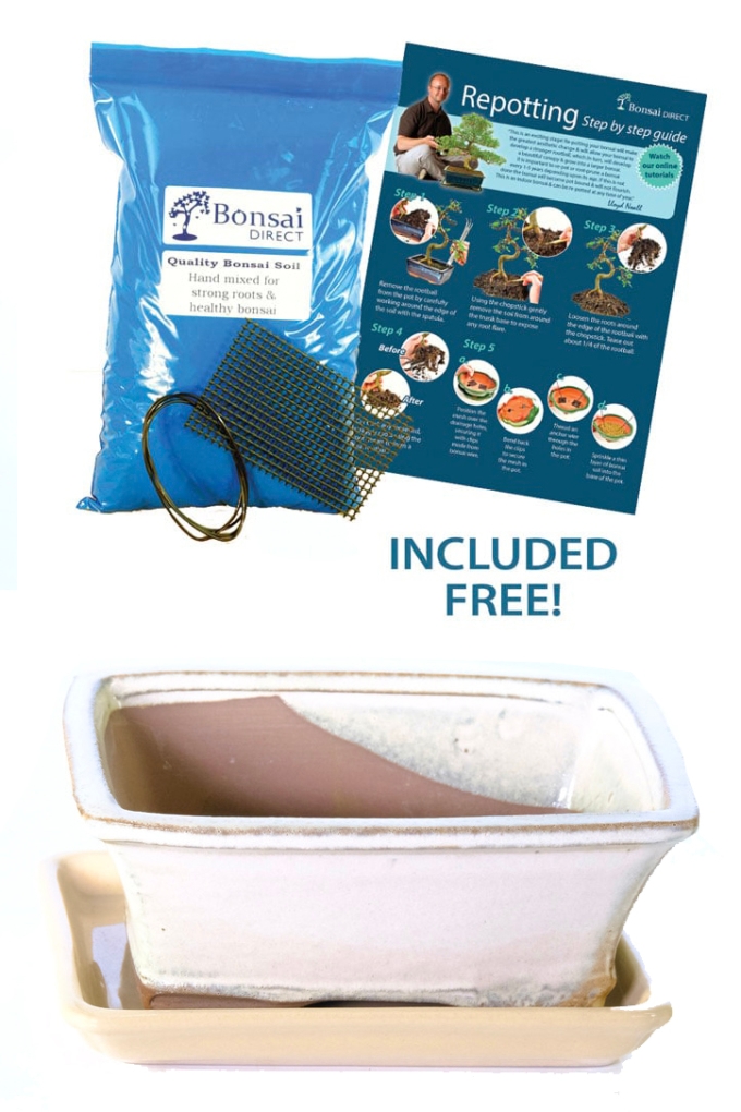 Our premium bonsai pot packages come with everything you need for successful repotting. Each kit includes a detailed repotting guide, mesh for covering drainage holes, wire for securing the tree, a chopstick for working in the soil, and soil for the root ball. These essentials are provided at no extra cost to ensure your repotting experience is smooth and successful.Finally, for a visual guide on how to repot or root prune your bonsai, including preparing the pot, check out the short video below. We hope it proves to be a valuable resource on your bonsai care journey