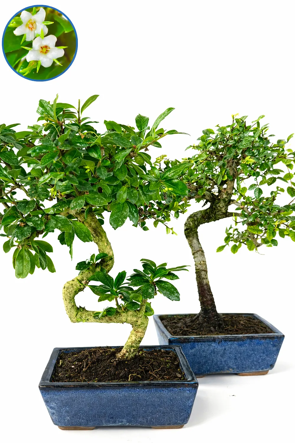 This pair of cheap bonsai trees offers a wonderful opportunity to own two established indoor bonsai at excellent value. The set includes an 8-year-old Chinese Elm bonsai and an 8-year-old flowering Fukien Tea Tree bonsai, each carefully grown and full of natural character.