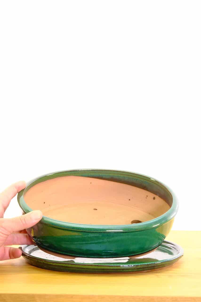 20cm Oval Glazed Forest Green Bonsai Pot with Matching Humidity Tray
