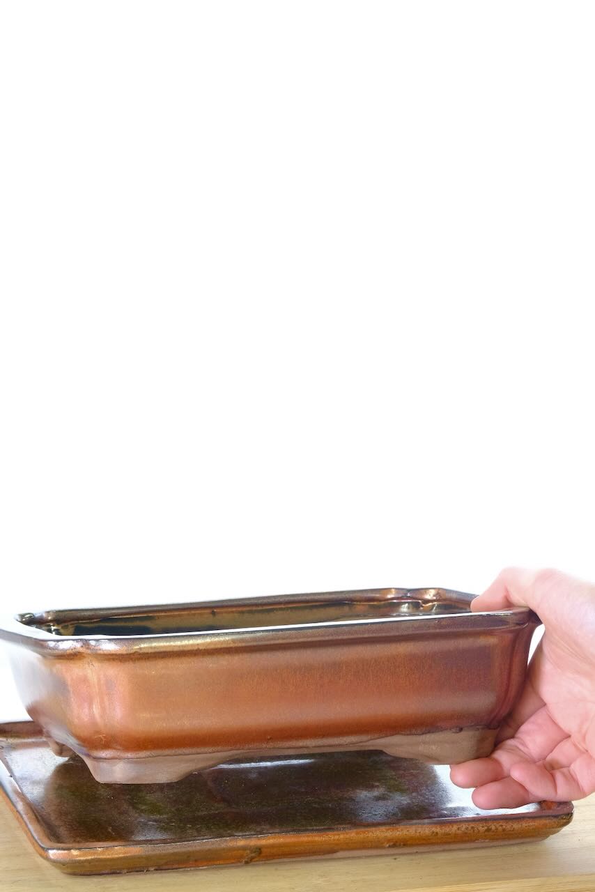Tasteful & Neutral Mottled Bronze Oxide Rectangular Glazed Bonsai Pot with Matching Drip Tray – Lovely Sparkly Sheen to the Pot with Fluted Corners