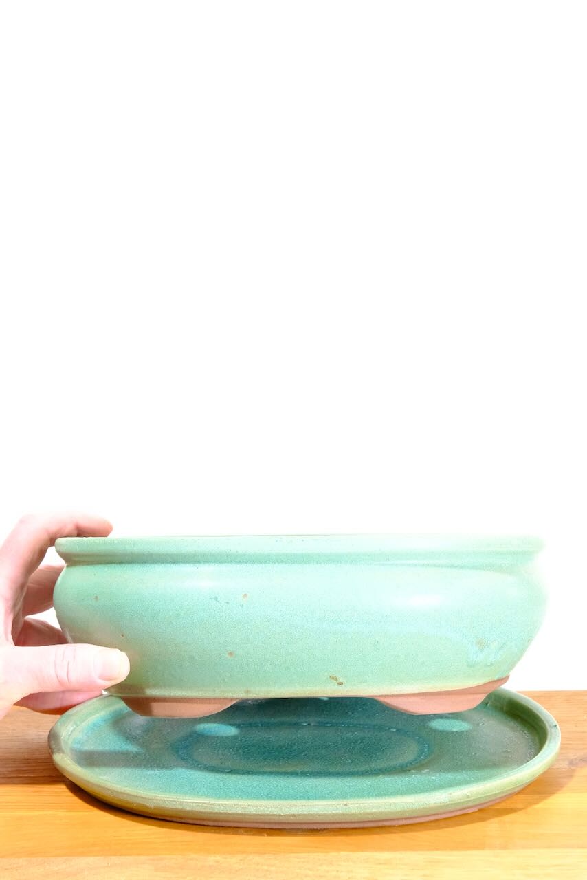A Stylish 10 inch/26cm Bonsai Pot for Sale with Matching Ceramic Drip Tray | Jade Green Glaze