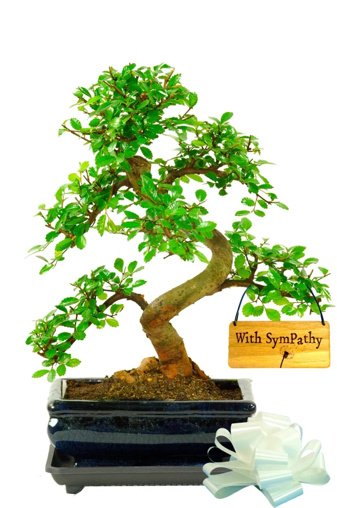 This twisty Chinese Elm bonsai offers a thoughtful and lasting sympathy plant gift when words feel difficult. Unlike flowers, it continues to grow, providing comfort and a sense of continuity over time. Its compact indoor form allows it to stay close, while gentle care encourages calm and reflection. Supplied with a tasteful ‘With Sympathy’ wooden tag and optional extras, it is easy to look after and suitable for beginners. Meaningful and enduring, this living bonsai becomes a quiet reminder of love, strength, and remembrance long after it is received.