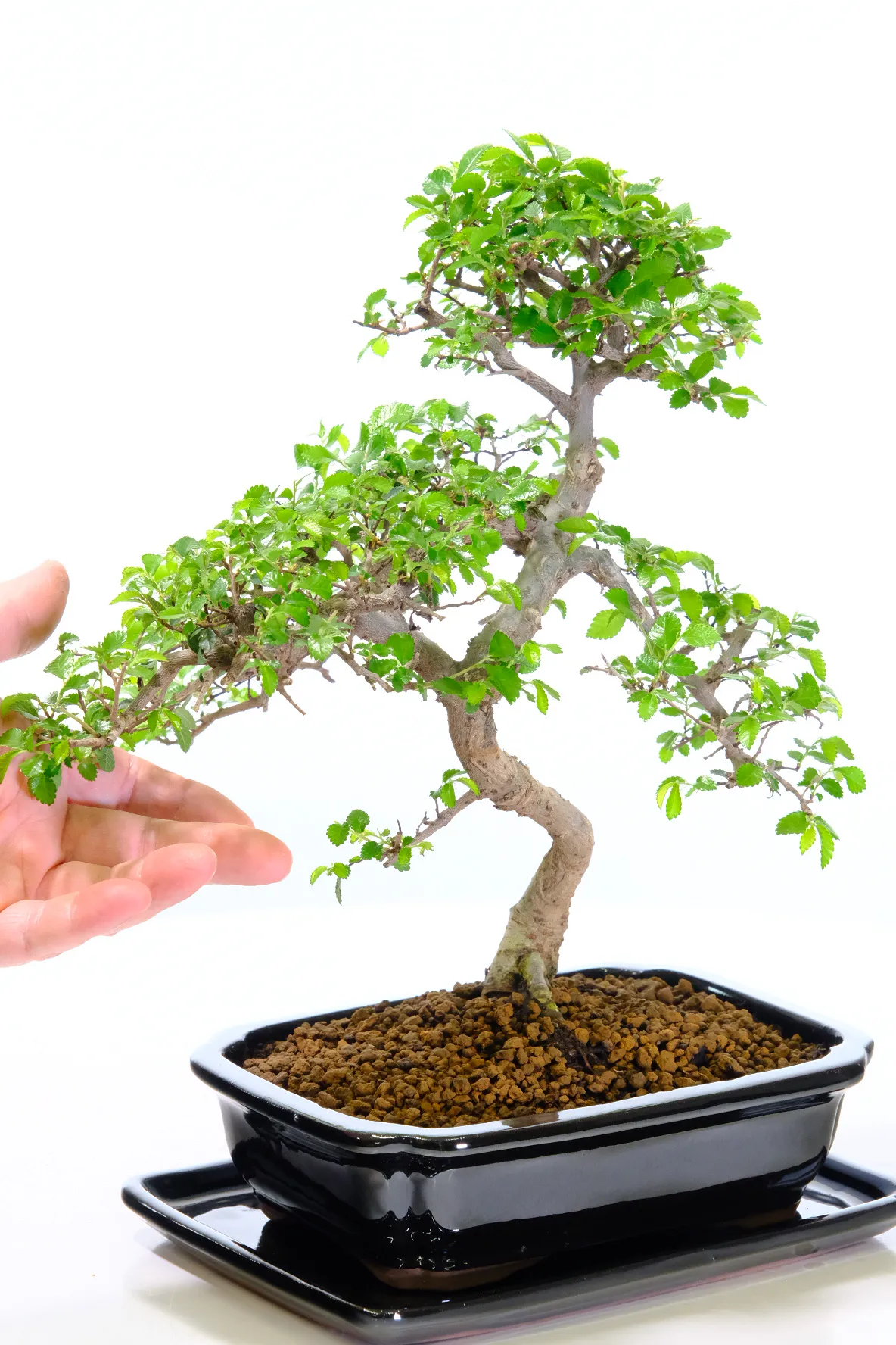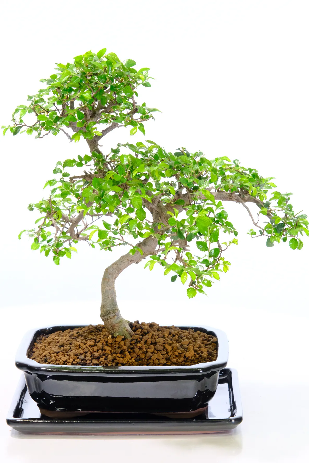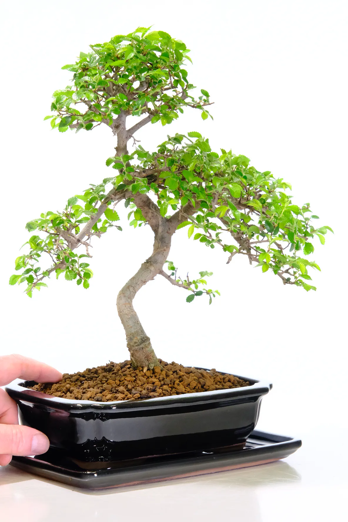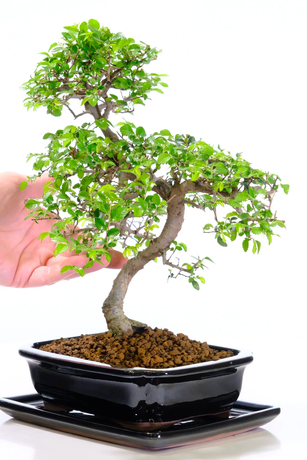This Premium Chinese Elm bonsai (Ulmus parvifolia) features a gorgeous twisty trunk, striking exposed roots, and a fresh canopy of vibrant green leaves. Known as one of the best choices for a beginners bonsai tree, it is hardy, forgiving, and easy to care for. Planted in a sleek glossy black ceramic pot with a matching ceramic drip tray, this is the exact tree you will receive — carefully shaped by our experienced family team at Bonsai Direct.