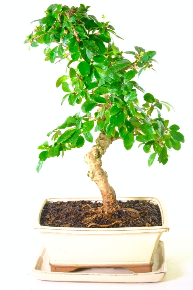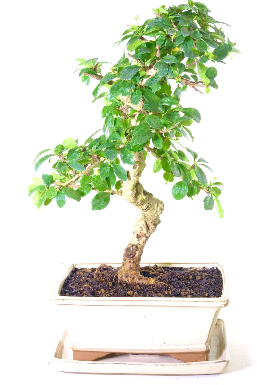 With its beautifully twisted trunk and elegantly styled branches, this bonsai exudes character and charm. The rich, glossy leaves are perfectly arranged, creating a harmonious balance that showcases the artistry of nature. Potted in a stylish soft cream neutral ceramic pot with a matching drip tray. During the summer months, it delights with delicate white flowers, adding an enchanting touch to your home or office. Don’t miss out on this fantastic offer to own a piece of living art that will bring joy and tranquility for years to come!