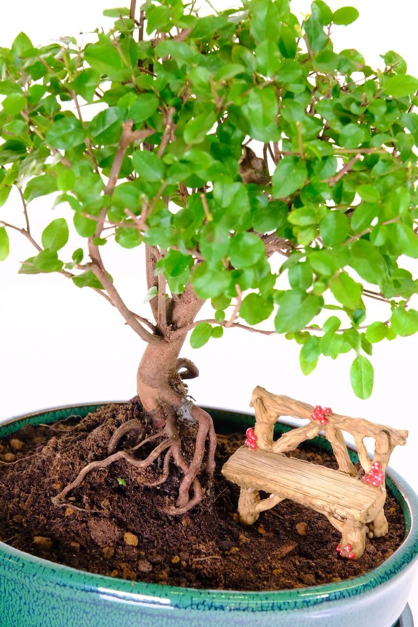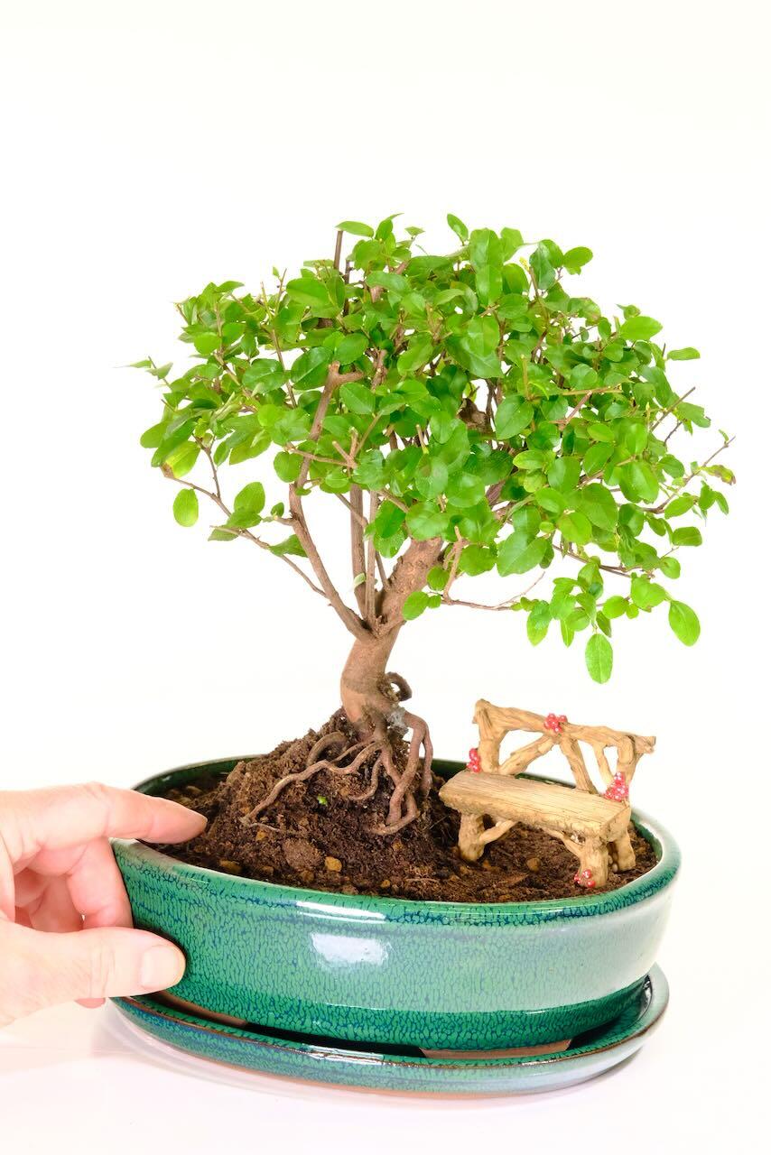 This 8-year-old Sageretia theezans bonsai features a graceful non-twisting trunk, colourful seasonal foliage and a beautifully nostalgic miniature garden scene complete with an ornate bench beneath the branches. Potted in a brand-new forest green ceramic pot with a matching drip tray, it offers warmth, charm and gentle movement in a compact form. Its soft greens, bronze tones and occasional plum-like fruits create year-round interest, while its adaptable nature makes it an ideal