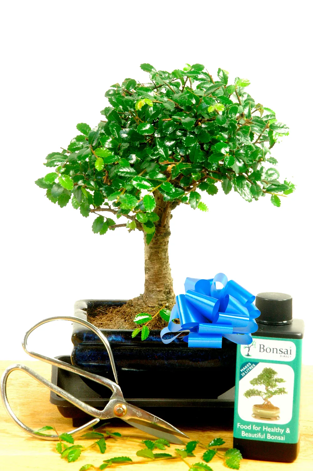 Start your bonsai journey with our small bonsai plant starter kit, featuring a beautifully styled 6-year-old orchard-style bonsai and everything you need to care for it. Each bonsai in the kit is styled in a charming broom style, with a naturally shaped canopy reminiscent of an orchard tree. Also included is a dark-coloured plastic drip tray, a bottle of our bonsai fertiliser, and a pair of pruning scissors. Care instructions are included free with all bonsai! Grown with care on our nursery, these are healthy, well-established starter bonsai—ideal as a gift or for anyone beginning their bonsai adventure.