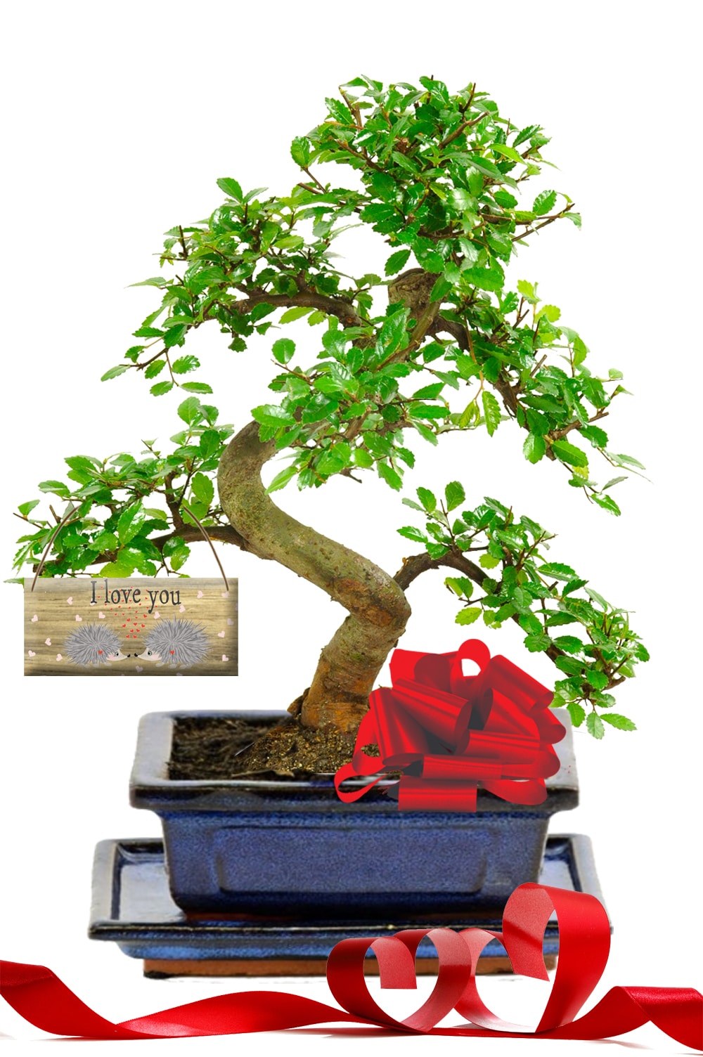 The perfect beginners indoor bonsai tree with lovely ‘I Love You’ hedgehog design tag and drip tray. Twiggy and twisty 8 year old indoor Chinese Elm with naturally small leaves which symbolises inner strength, intuition, wisdom and love.