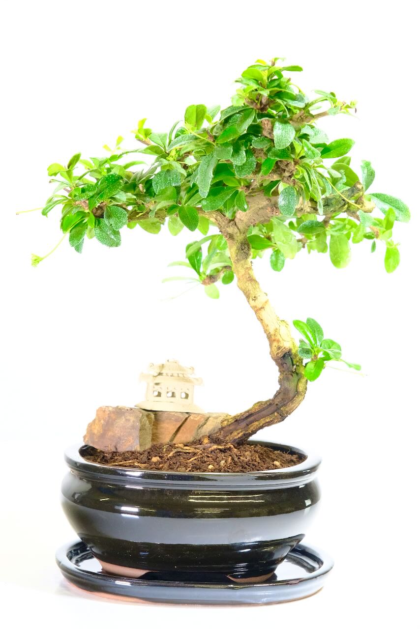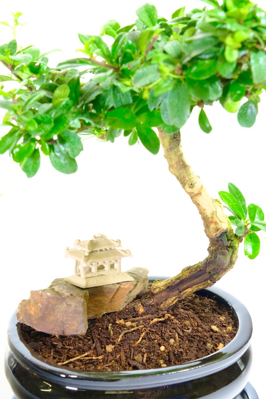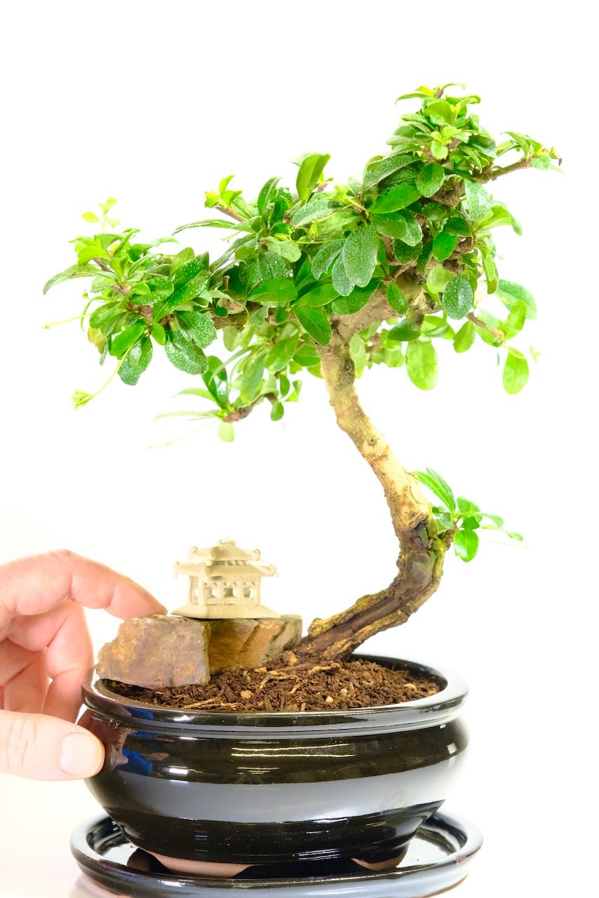 This very cute seven-year-old Carmona microphylla stands 30cm tall and shows gentle trunk movement with glossy evergreen foliage. It sits in a brand new glossy black glazed pot with a matching drip tray and features a rock supporting an orange handmade oriental temple; to create a peaceful bonsai garden of contemplation. Summer white flowers add seasonal charm. Grown with care on our Devon nursery, this bonsai is perfect for beginners wanting a calm, artistic indoor tree. This bonsai also features a subtle shari running along the lower part of the trunk, adding a naturally weathered look that enhances its age, character, and artistic appeal.