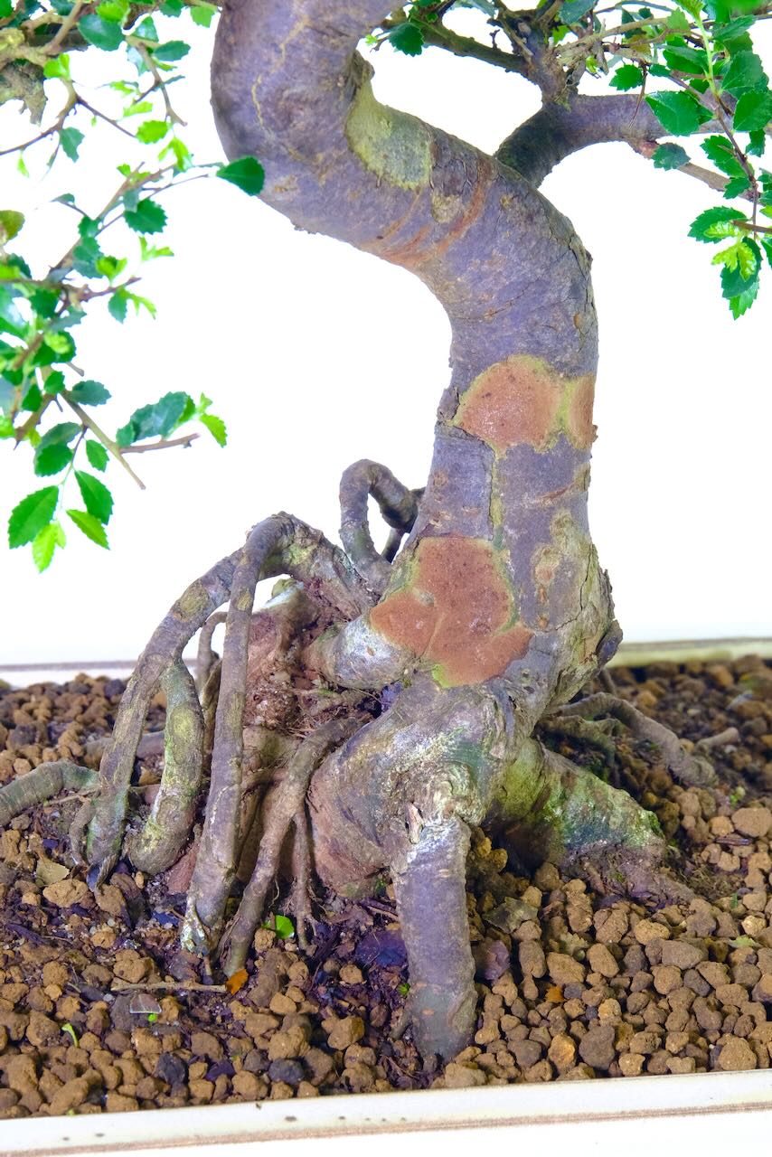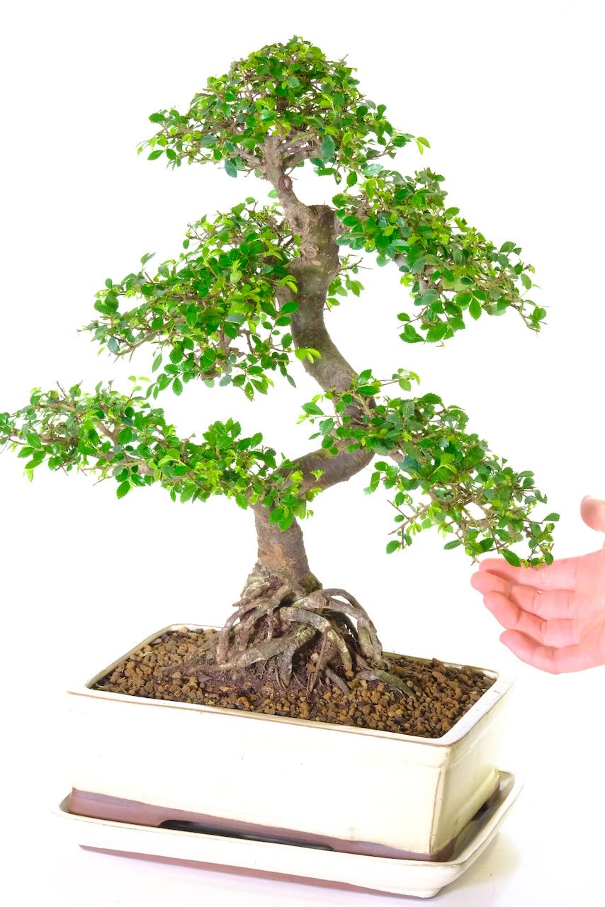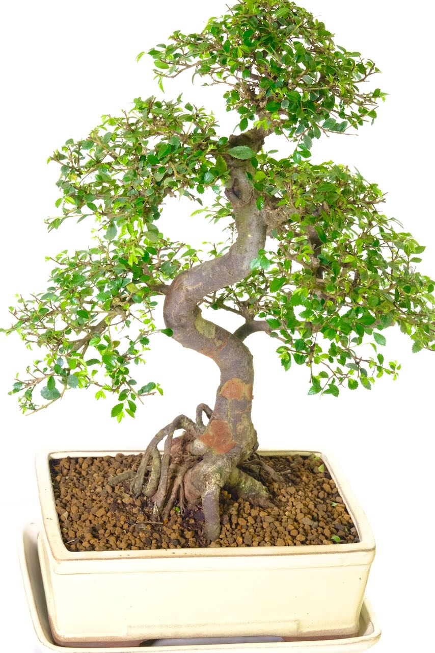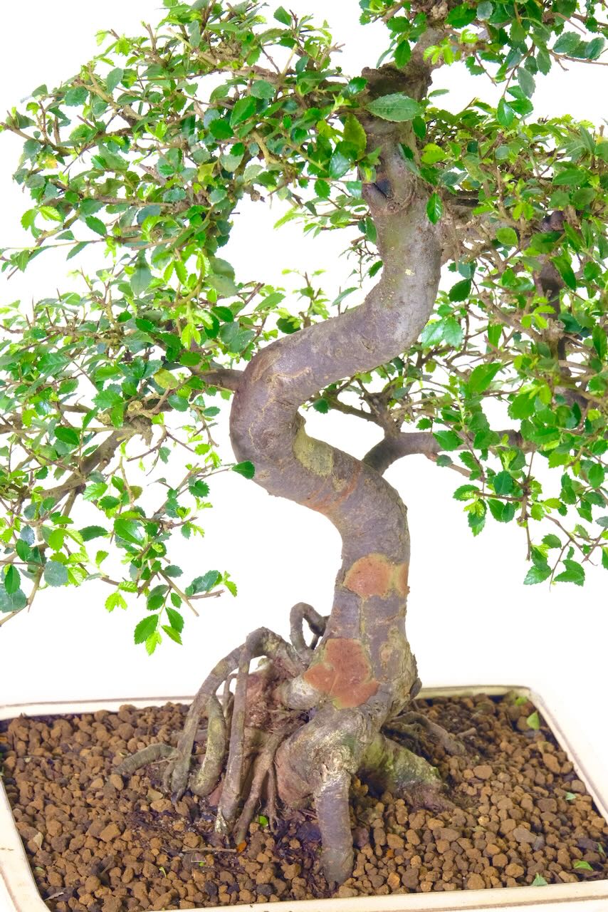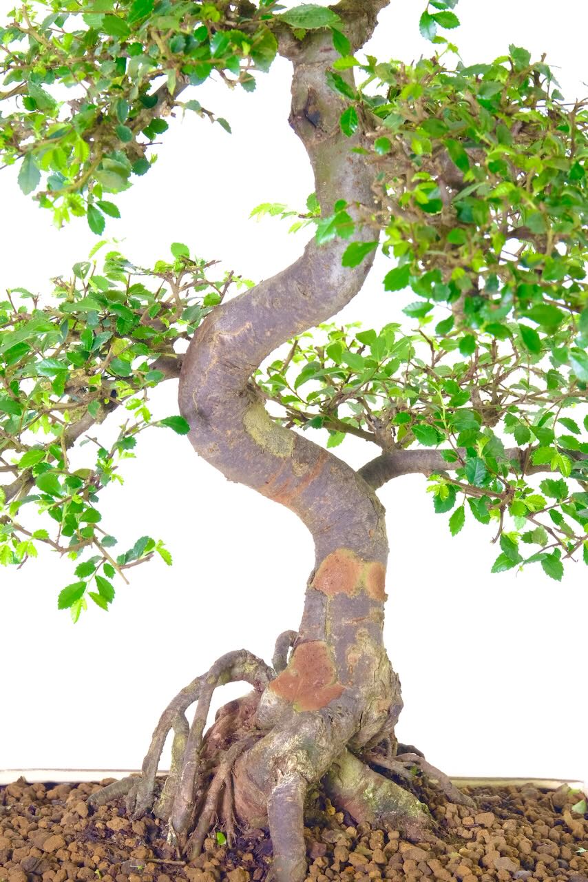 Enjoy the beauty of our impressive 24-year-old Chinese Elm (Ulmus parvifolia) indoor bonsai, gracing any space with its thick and shapely trunk boasting an incredible texture and aged features. Its twisty and captivating form showcases nature’s artistry throughout the curves.