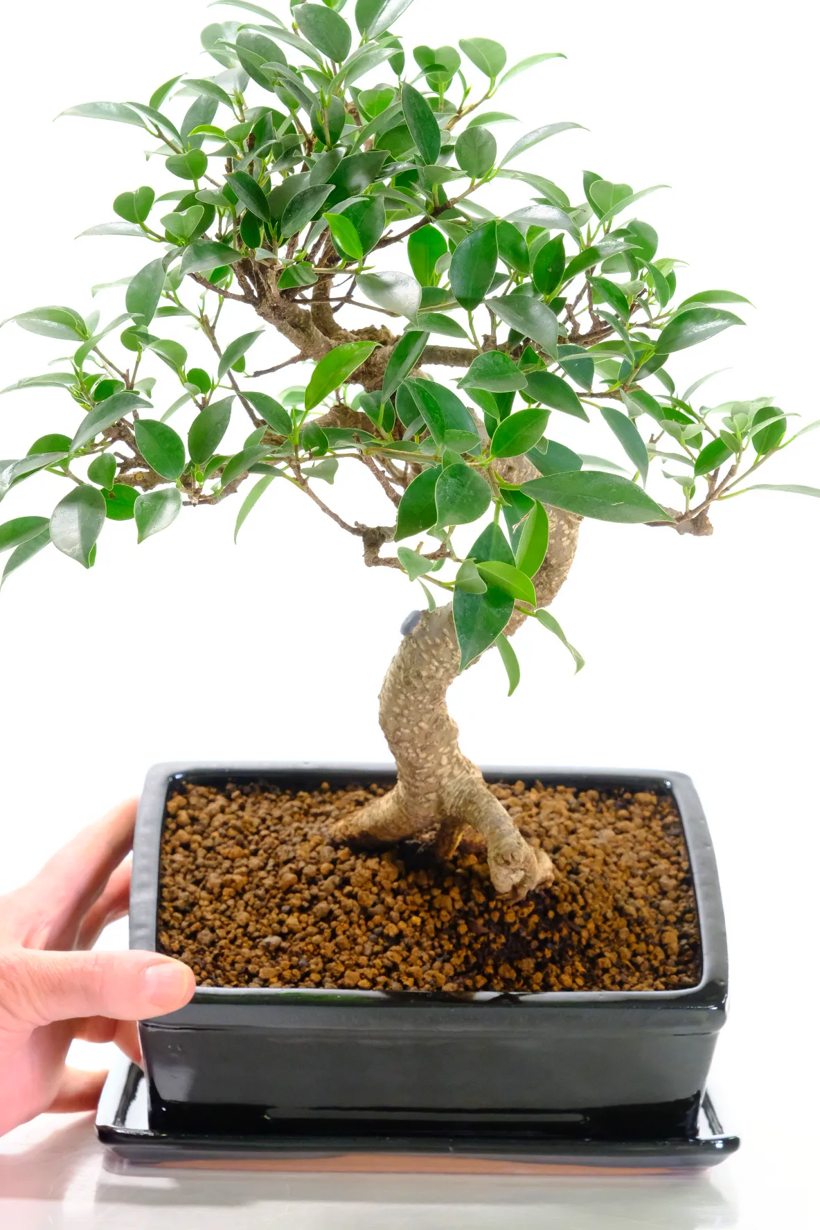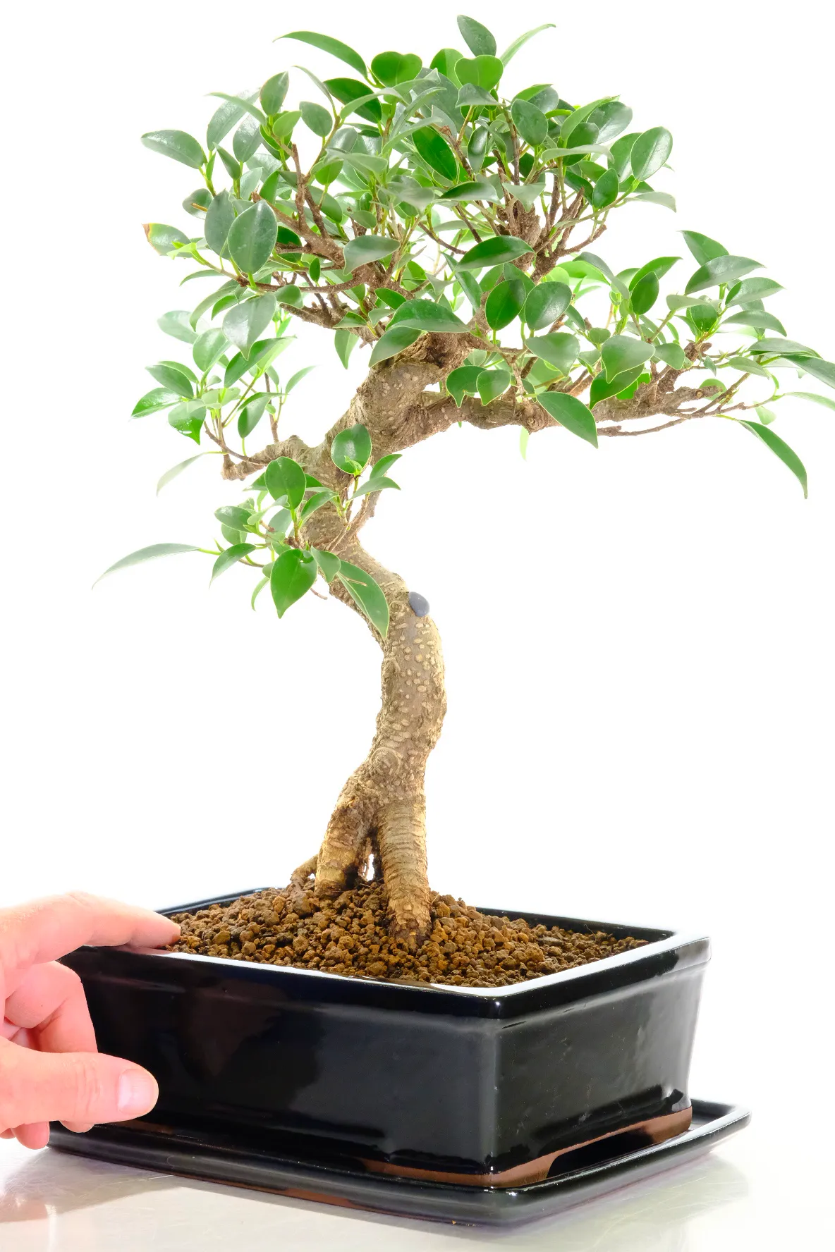 A striking Ficus retusa bonsai tree with a beautifully twisty trunk rising above phenomenal exposed roots. Soft silver striations in the bark add depth and character, while a canopy of large, glossy green leaves brings balance and vibrancy to the design. Planted in a sleek black bonsai pot using high-quality Akadama soil, this ficus bonsai tree offers both style and excellent root health. A matching ceramic drip tray is included for easy display. This is the exact tree you will receive, carefully selected as part of our Premium range by our family-run nursery, with a strong focus on quality and sustainable growing.