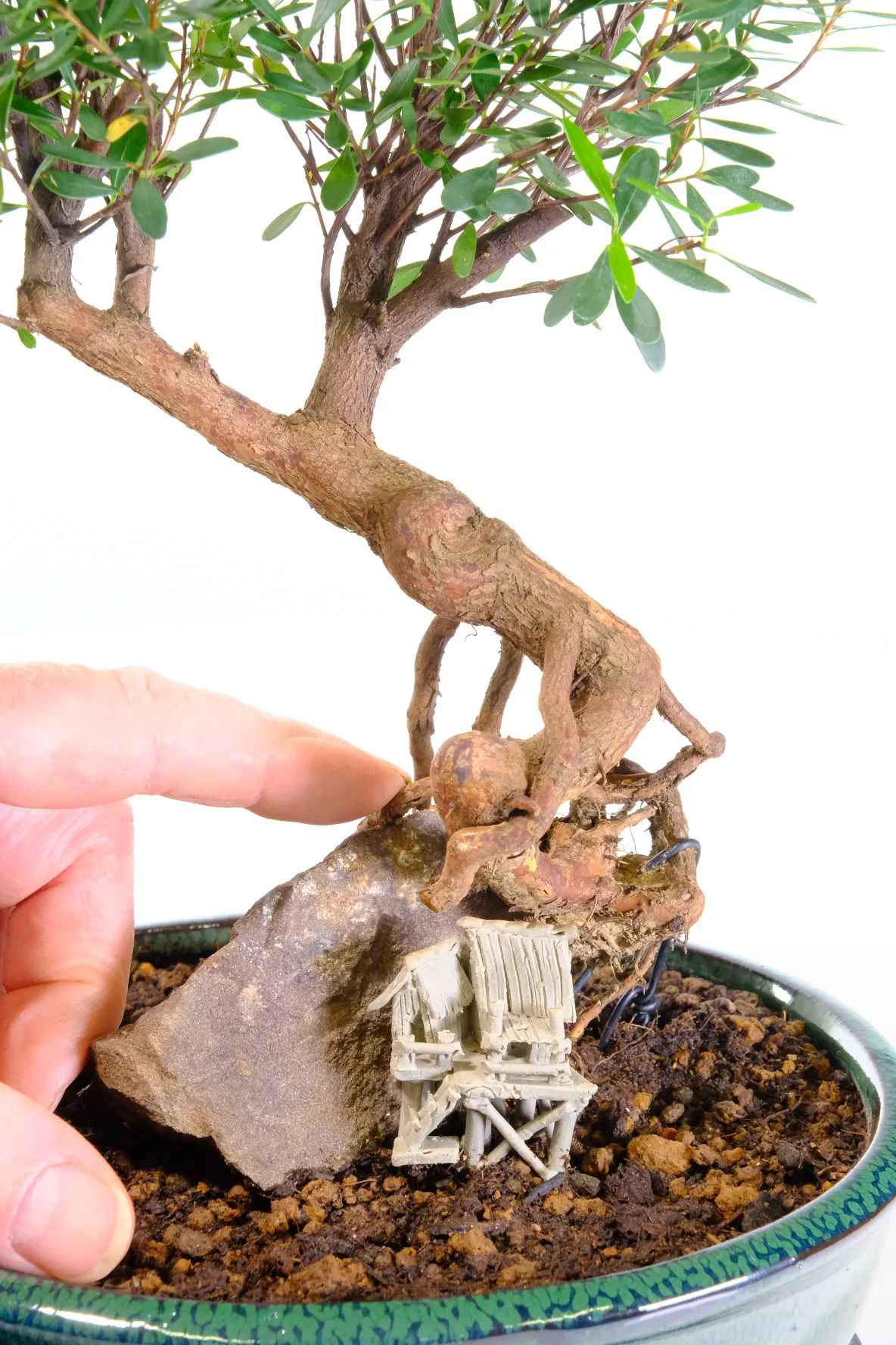 Beyond its natural beauty, this bonsai stands out for its artistic appeal. Its roots elegantly cascade over the rock, creating a sense of movement and life. To enhance the miniature landscape, a handmade Chinese stilt house ornament is included. This charming detail adds character and storytelling to the display, making the bonsai feel like a living scene rather than just a tree.