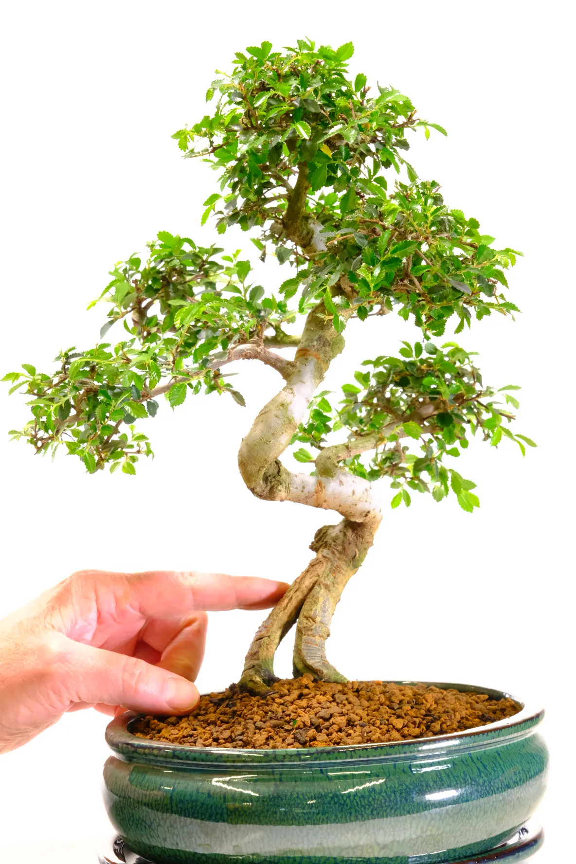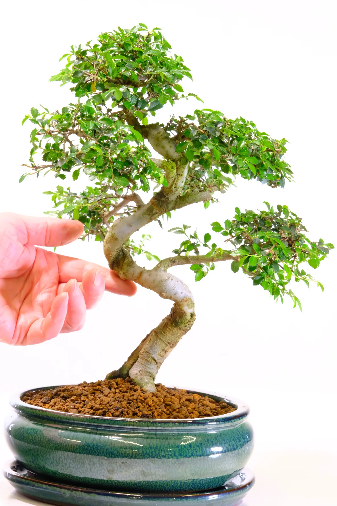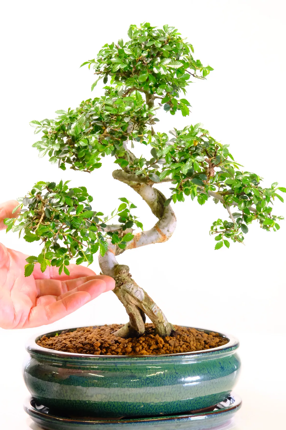 Premium indoor Chinese Elm bonsai (Ulmus parvifolia) with twisty trunk and compact foliage pads. 14 years old and 37 cm tall, presented in a forest-green ceramic pot with matching drip tray. A refined and easy-care indoor bonsai ideal for beginners or collectors. I love the neat foliage pads and the lovely twisting flow of this compact beginners indoor bonsai tree. It is graceful yet characterful with clean lines. The split trunk is phenomenal and just look at that bark!