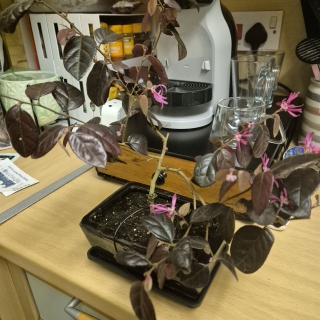 A sensational Chinese Blush Tree Bonsai with purple leaves and hot pink spider like flowers – a very pretty Bonsai with charming attributes and striking colour