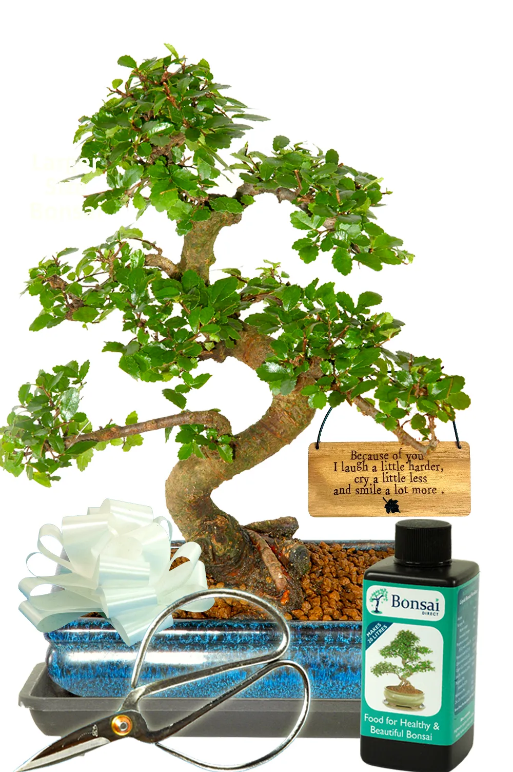 This complete starter pack arrives ready to enjoy. The bonsai comes planted in a midnight blue ceramic pot and sits neatly on a dark coloured drip tray. In addition, the kit includes bonsai pruning scissors, bonsai fertiliser, and the care leaflet. A wooden hanging tag reads, “Because of you I laugh a little harder, cry a little less and smile a lot more,”adding a heartfelt finishing touch.