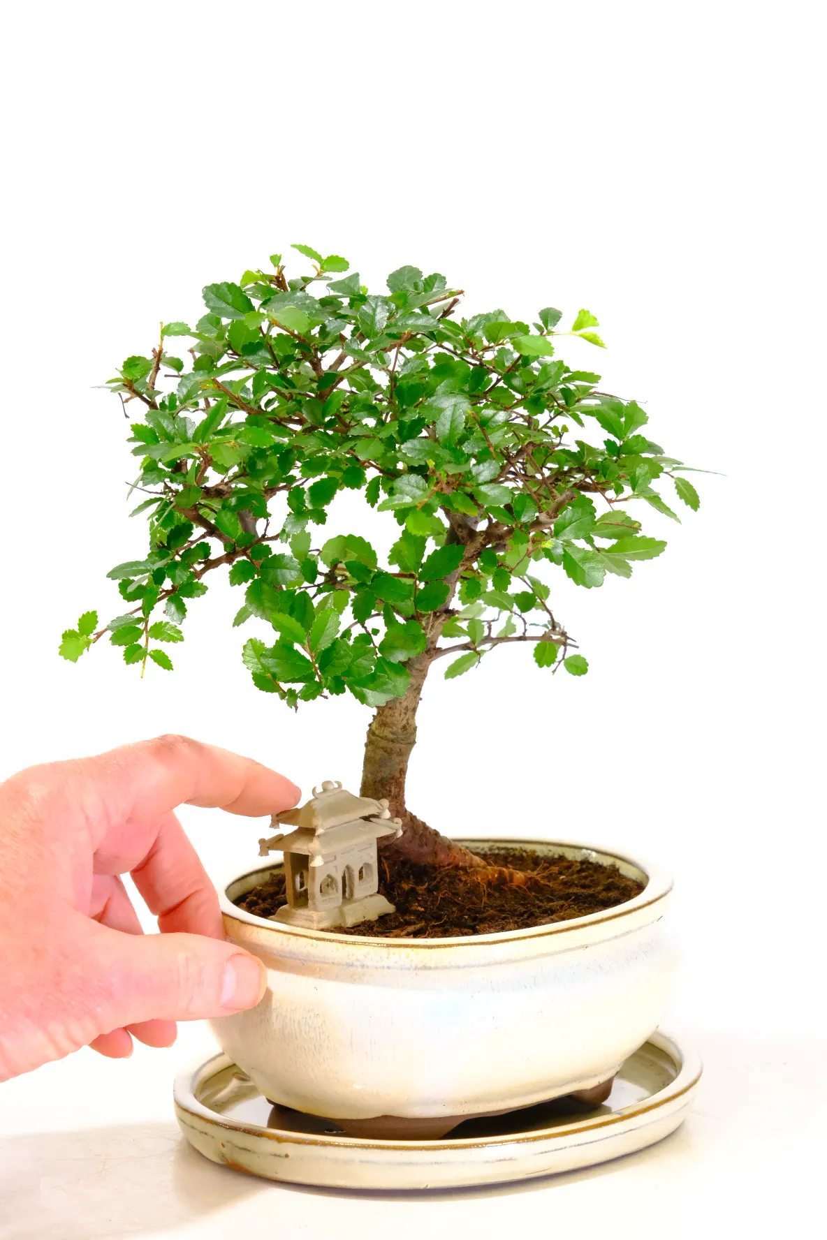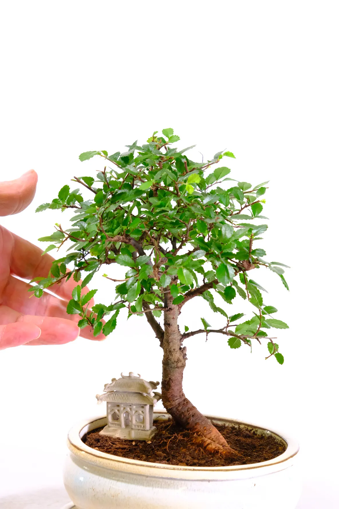 A charming dwarf Chinese Elm bonsai, Ulmus parvifolia, styled in an elegant informal upright broom form with naturally small emerald leaves and graceful branching. This beautifully balanced bonsai displays fresh lime-green new season foliage and an attractive nebari that creates a strong natural base. Planted in a cream oval ceramic pot with matching drip tray and accompanied by a handmade oriental temple ornament, it forms a peaceful miniature landscape display. Easy to care for and resilient, Chinese Elm is widely regarded as one of the best bonsai species for beginners. You will receive the exact tree shown, complete with free care instructions and carefully prepared for safe delivery.