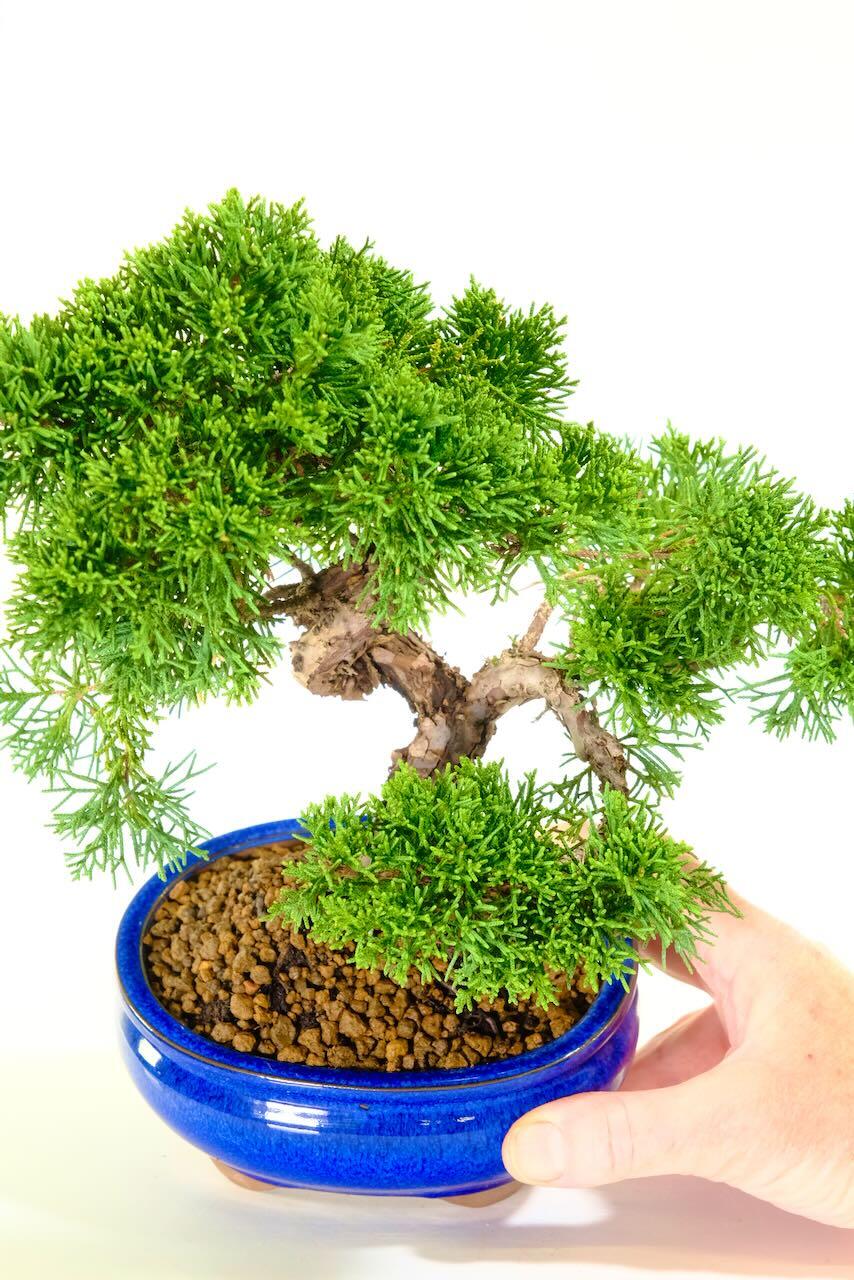 Potted in a brand-new deep blue oval ceramic bonsai pot, this tree exudes both tradition and contemporary flair. The glossy glaze enhances the natural tones of the bark and foliage, giving it a clean, modern finish that suits any space — indoors near bright light or outdoors in a sheltered garden spot.