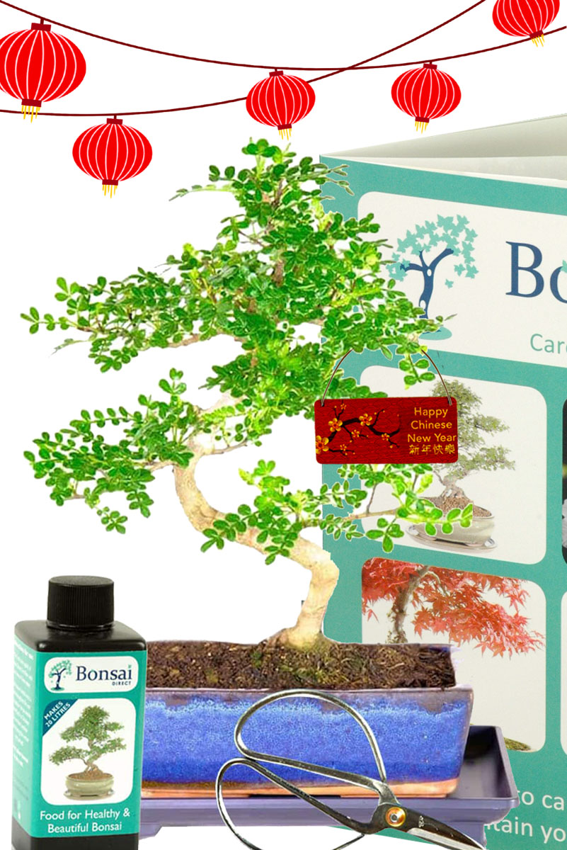 This Chinese New Year plant arrives as a carefully considered gift. Included are bonsai scissors for light shaping, a bottle of fertiliser to support healthy growth, and a printed Bonsai Direct care handbook. In addition, a “Happy Chinese New Year” wooden hanging tag adds a festive finishing touch that makes the gift feel personal and intentional.