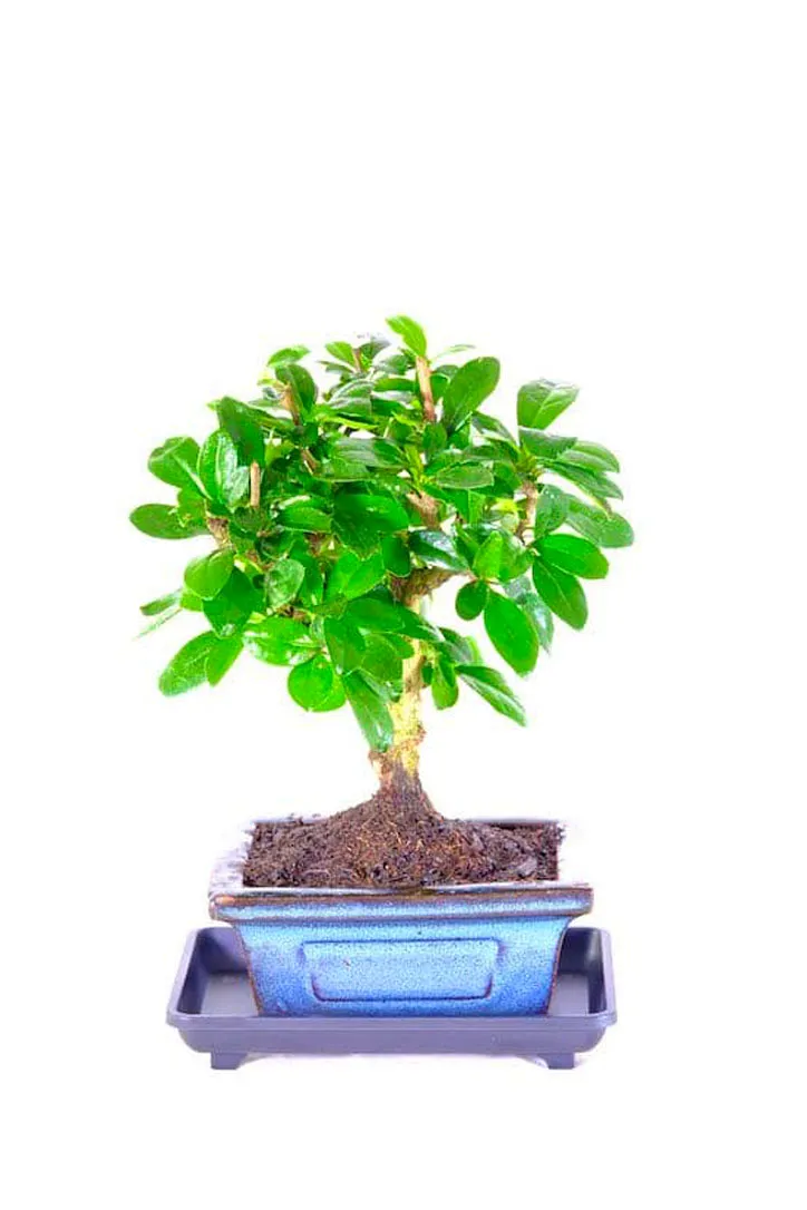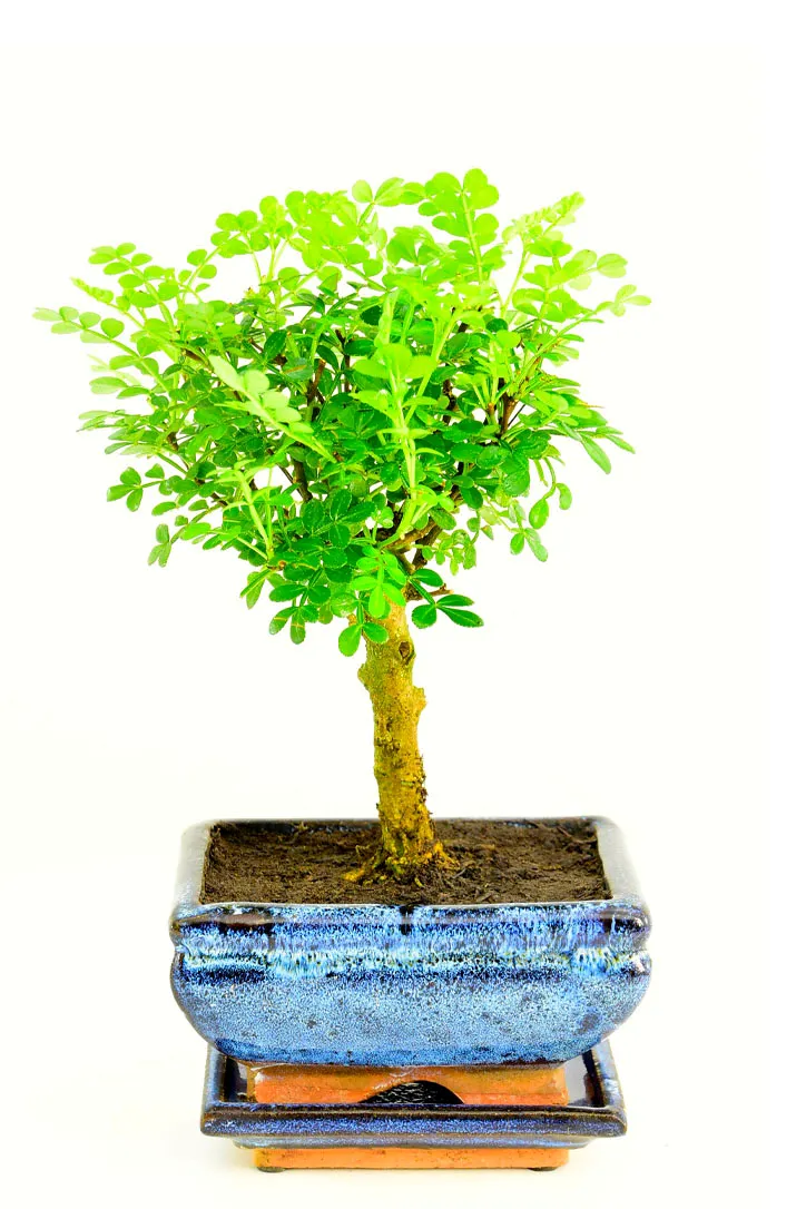 Each tiny bonsai tree comes planted in a navy blue ceramic pot that beautifully contrasts with the fresh green foliage. For added practicality, you can choose to include the matching ceramic drip tray at checkout.