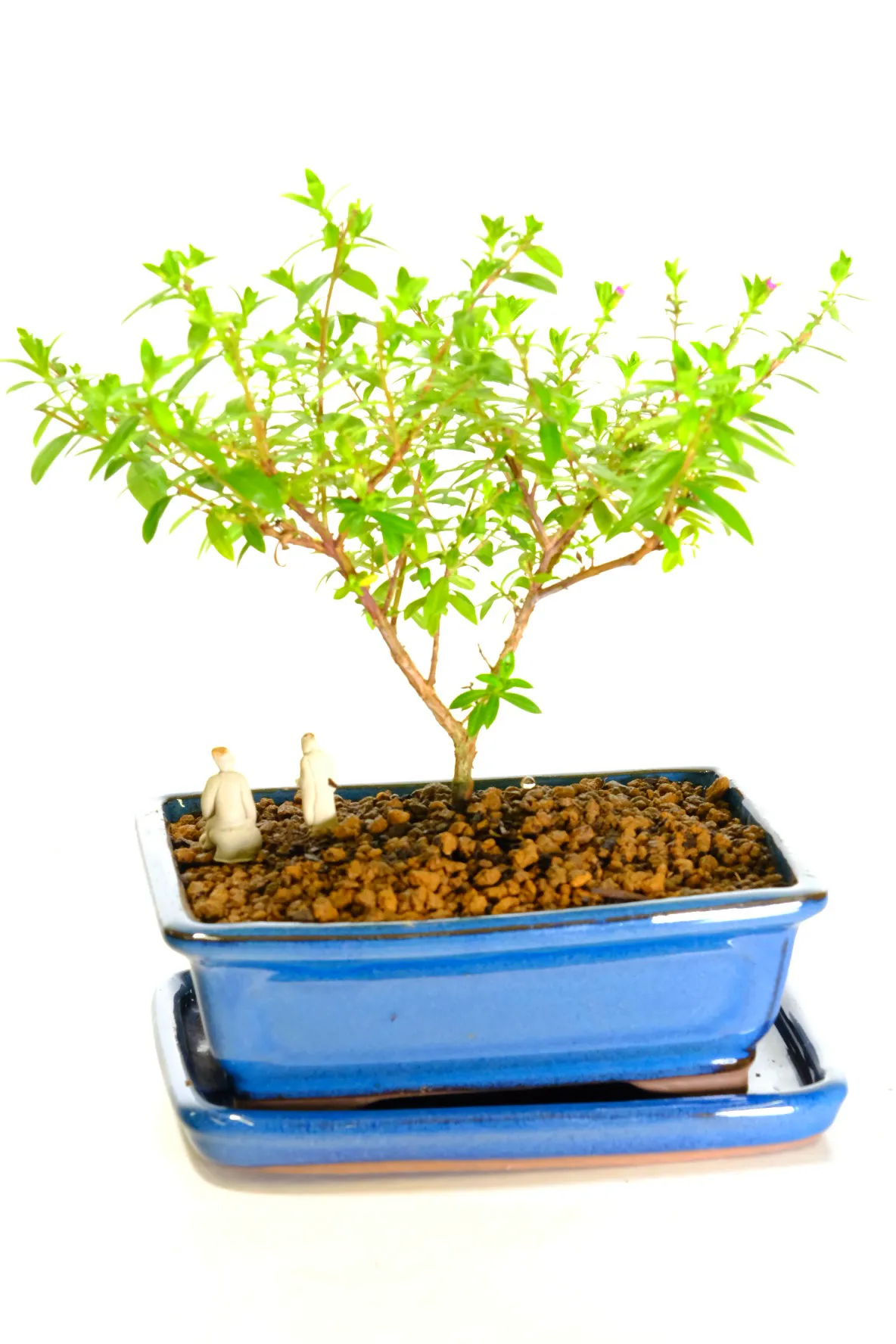 A charming 5-year-old starter Cuphea bonsai from our Premium Collection, perfect for styling and shaping. This tree features a twisty trunk, textured bark, and a fresh canopy of light green leaves. During spring and summer, it produces delicate purple flowers, adding seasonal colour. Planted in a blue ceramic pot with a matching drip tray, it arrives ready to display. Easy to care for and fun for beginners, this bonsai is an ideal introduction to the art of bonsai.