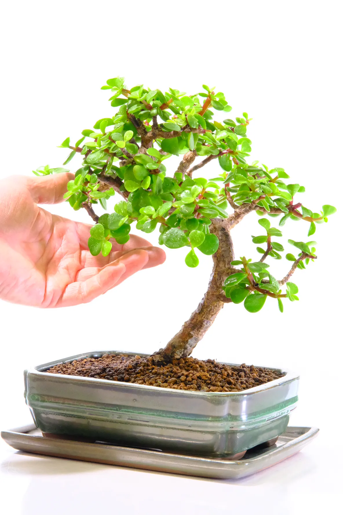 Potted in a brand-new silvery-green glazed ceramic pot with a matching tray, this Jade bonsai sits proudly as an informal upright tree with a wonderfully expressive design. Because Money Tree bonsai require far less water than most bonsai, this tree is a dream for beginners, students, and children. Perfect for anyone who may forget the occasional watering but still wants something beautiful and rewarding to grow.