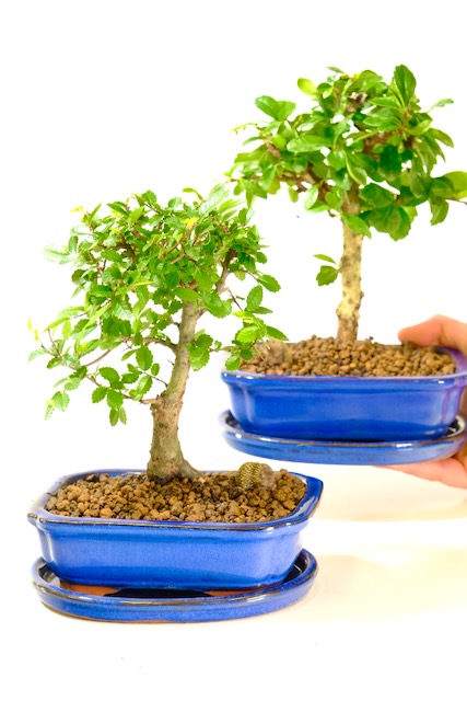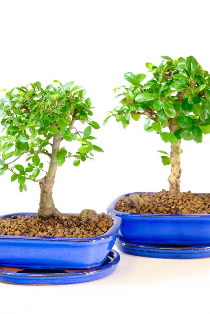 These two bonsai look especially good side by side. Their proportions feel balanced, their forms complement one another, and neither overwhelms the other. Because they share the same pot style and height, the pair feels cohesive. At the same time, their individual leaf shapes and growth habits keep things interesting.