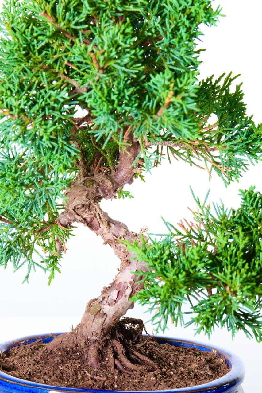 This delightful bonsai displays a twisty trunk with aged, flaky bark in warm reddish tones and a wonderfully natural root base that gives a woodland feel. Potted in a rich blue glazed ceramic pot, it combines elegance with a sense of age and stability.