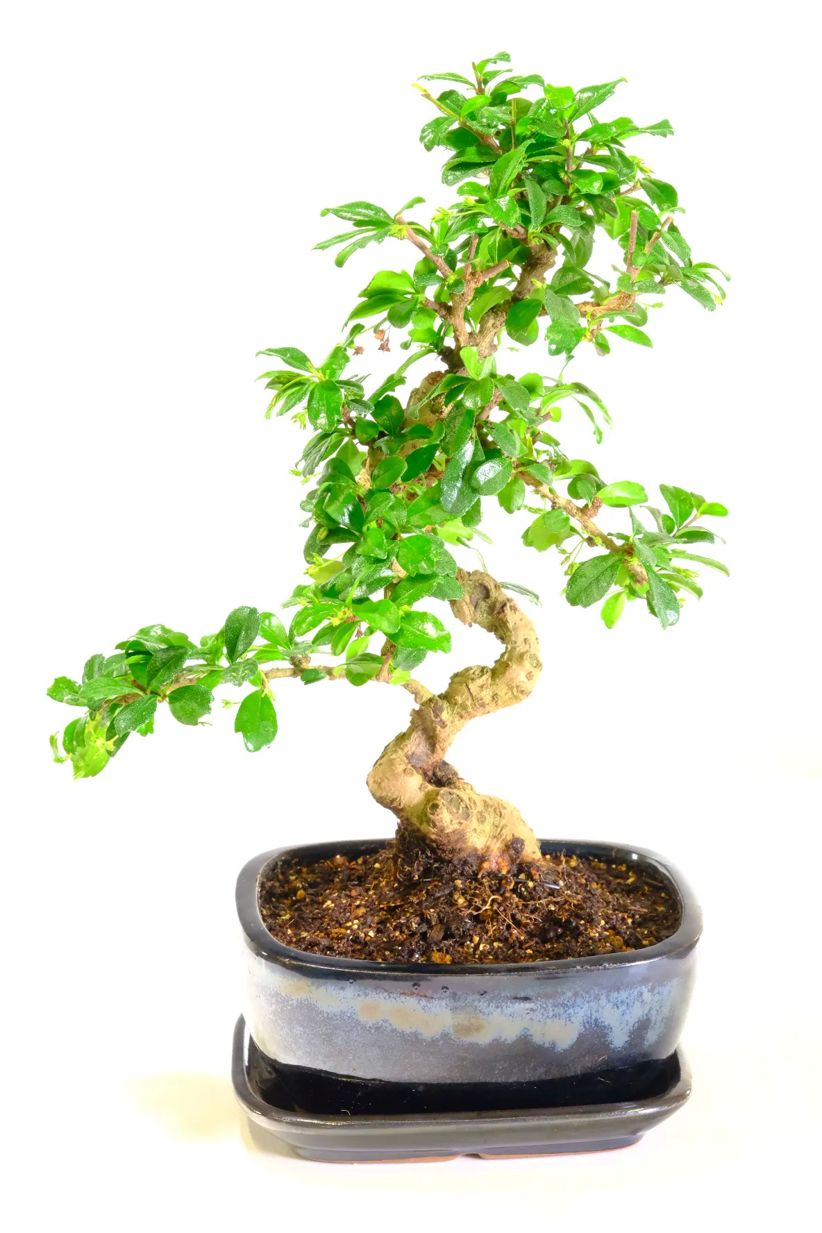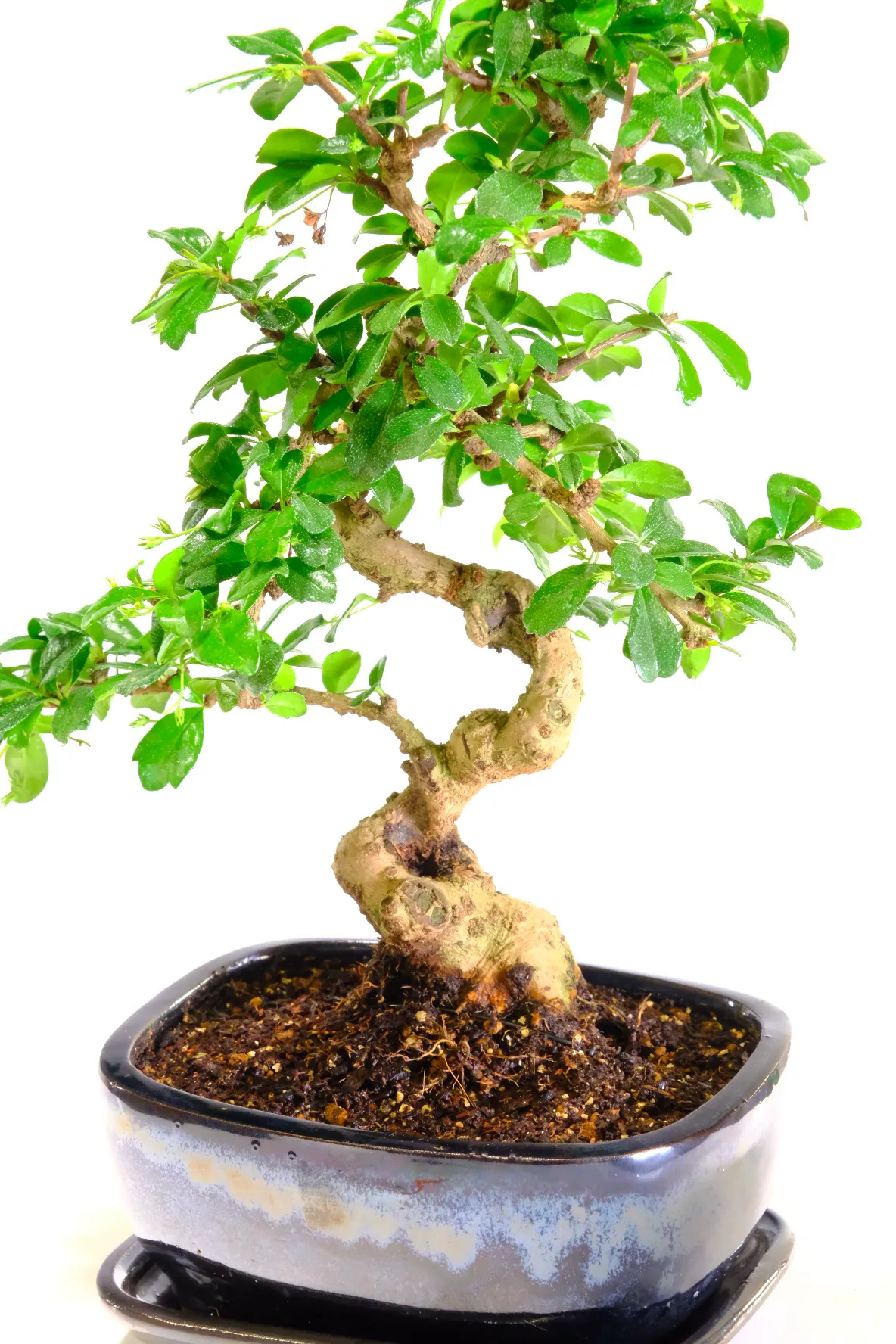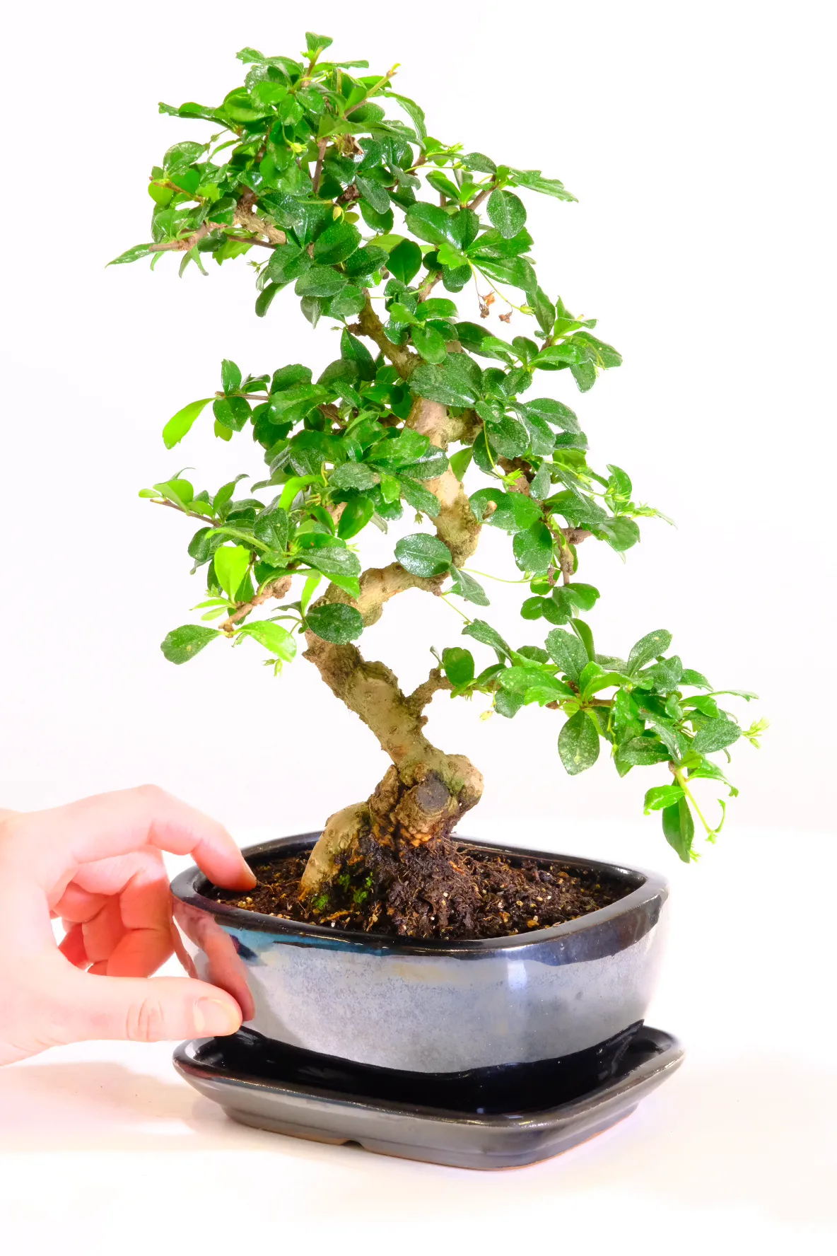 This bonsai is presented in a brand new gloss black ceramic bonsai pot, paired with a matching ceramic drip tray. The dark glaze enhances the richness of the foliage while also emphasising the pale tones of the trunk and exposed roots.
