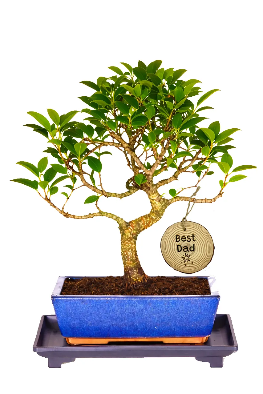 Gift Dad something meaningful and lasting with this elegant Ficus bonsai. With its impressive 12-year-old twisty trunk and vibrant, glossy green leaves, this indoor bonsai is both low-maintenance and full of character. Potted in a deep navy blue ceramic pot with an optional drip tray, it’s the perfect addition to any space. Finished with a rustic wooden “Best Dad” hanging tag, this bonsai is a heartfelt and stylish Father’s Day gift he’ll treasure for years. The Ficus is an excellent bonsai for beginners, being very low maintenance and slow growing.