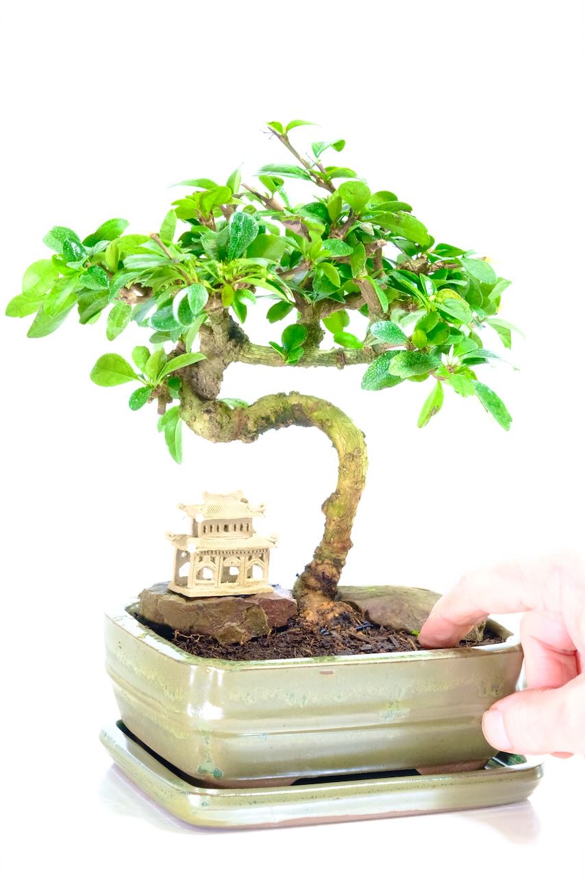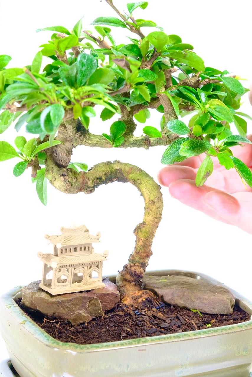 This Fukien Tea bonsai is potted into a brand-new silvery green ceramic bonsai pot, chosen to enhance the tree’s refined character. The gentle metallic tones complement the bark beautifully and highlight the glossy foliage. In addition, the composition includes carefully placed rocks and a handcrafted ornate Chinese temple, creating a subtle garden scene that adds depth, storytelling, and traditional oriental charm.
