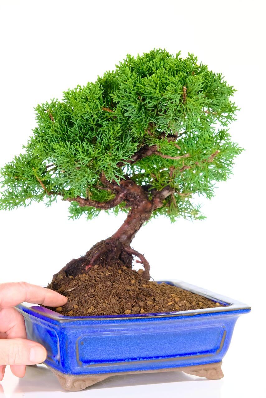 Potted in a brand-new royal blue glazed ceramic pot, the bonsai immediately commands attention. The deep blue glaze enhances the vibrant evergreen foliage, while also drawing out the reddish cinnamon tones in the bark. Together, the colours create a bold, luxurious composition that feels both traditional and strikingly modern.