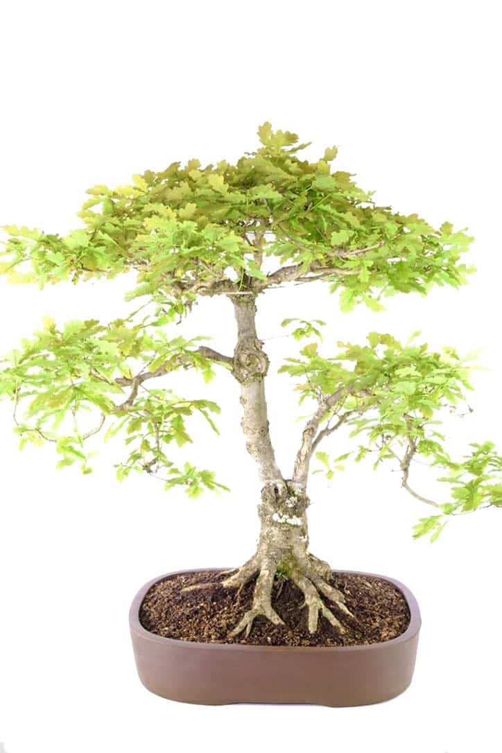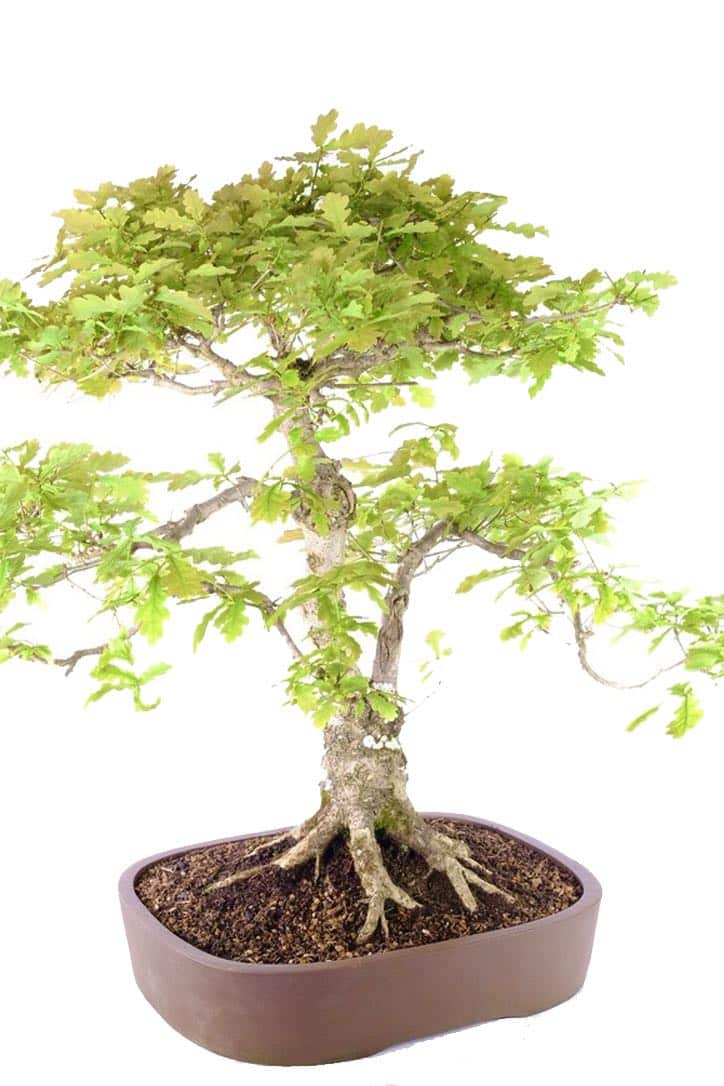 This is the exact English Oak bonsai you will receive. It sits in an unglazed ceramic pot, which complements its natural tones and enhances its rugged, authentic appearance.