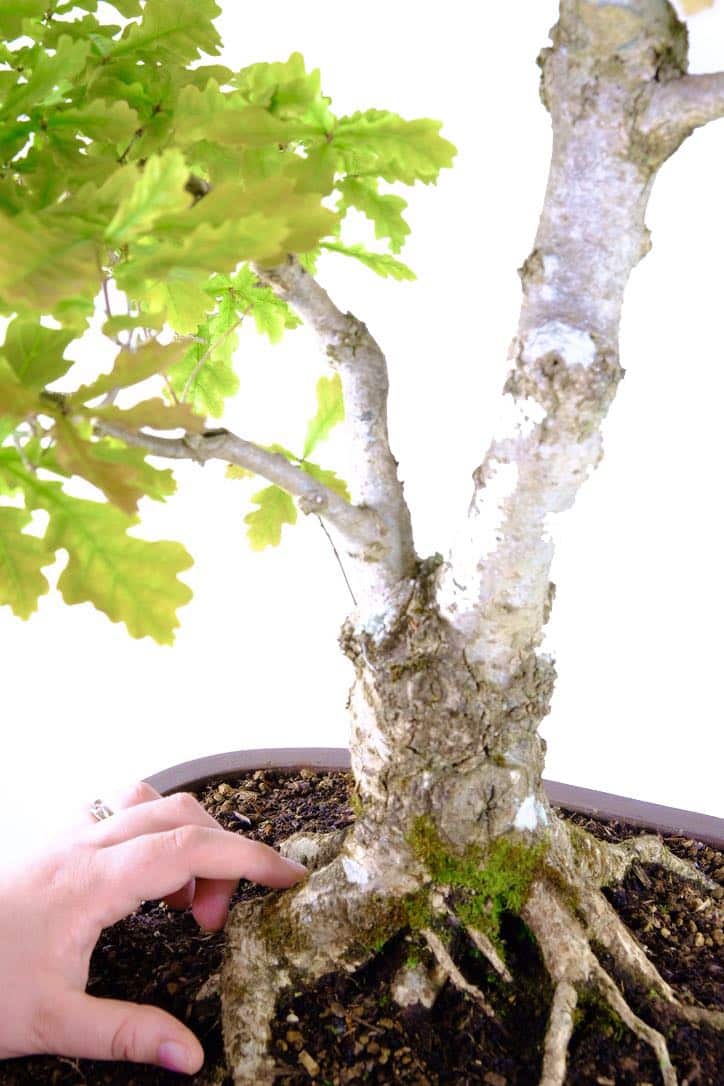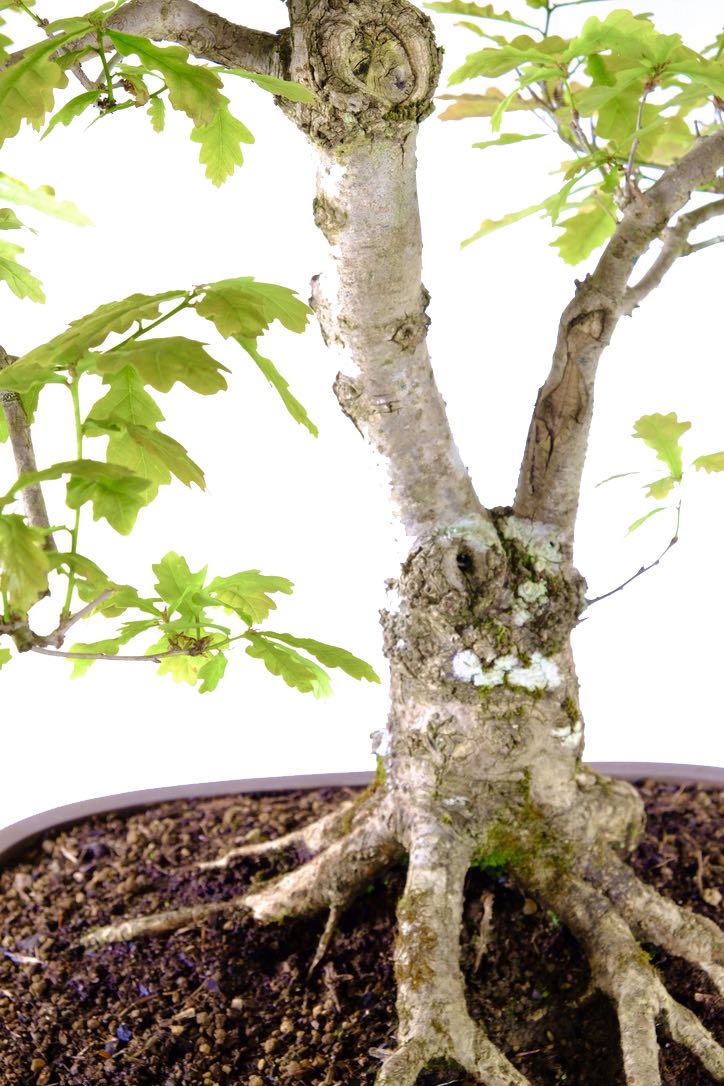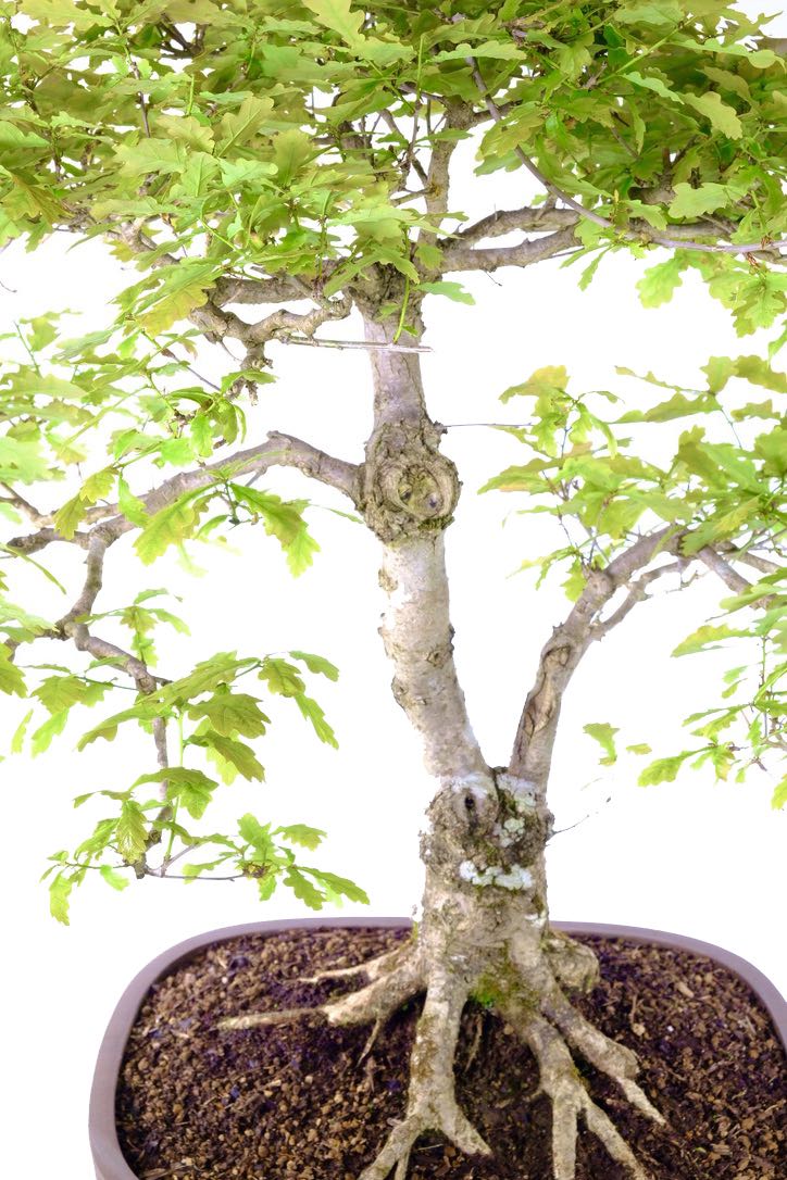 The exposed root system strengthens the tree’s connection to the soil while enhancing its aged appearance. Meanwhile, the trunk and branching create a layered and expressive silhouette that feels both natural and carefully refined. The combination of textured bark, structured canopy, and vibrant foliage produces a harmonious composition that reflects the enduring beauty of the Quercus robur.
