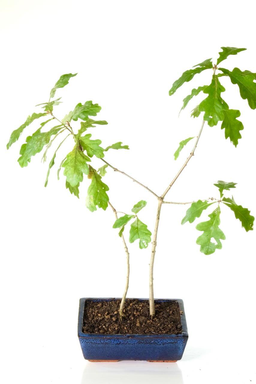 Formed from two young oaks growing side by side, the roots intertwine beautifully, leading the eye up the slender trunks into a canopy of fresh, lobed leaves. With time and care, the branches and trunk will thicken, allowing you to shape and refine it into a truly majestic specimen.