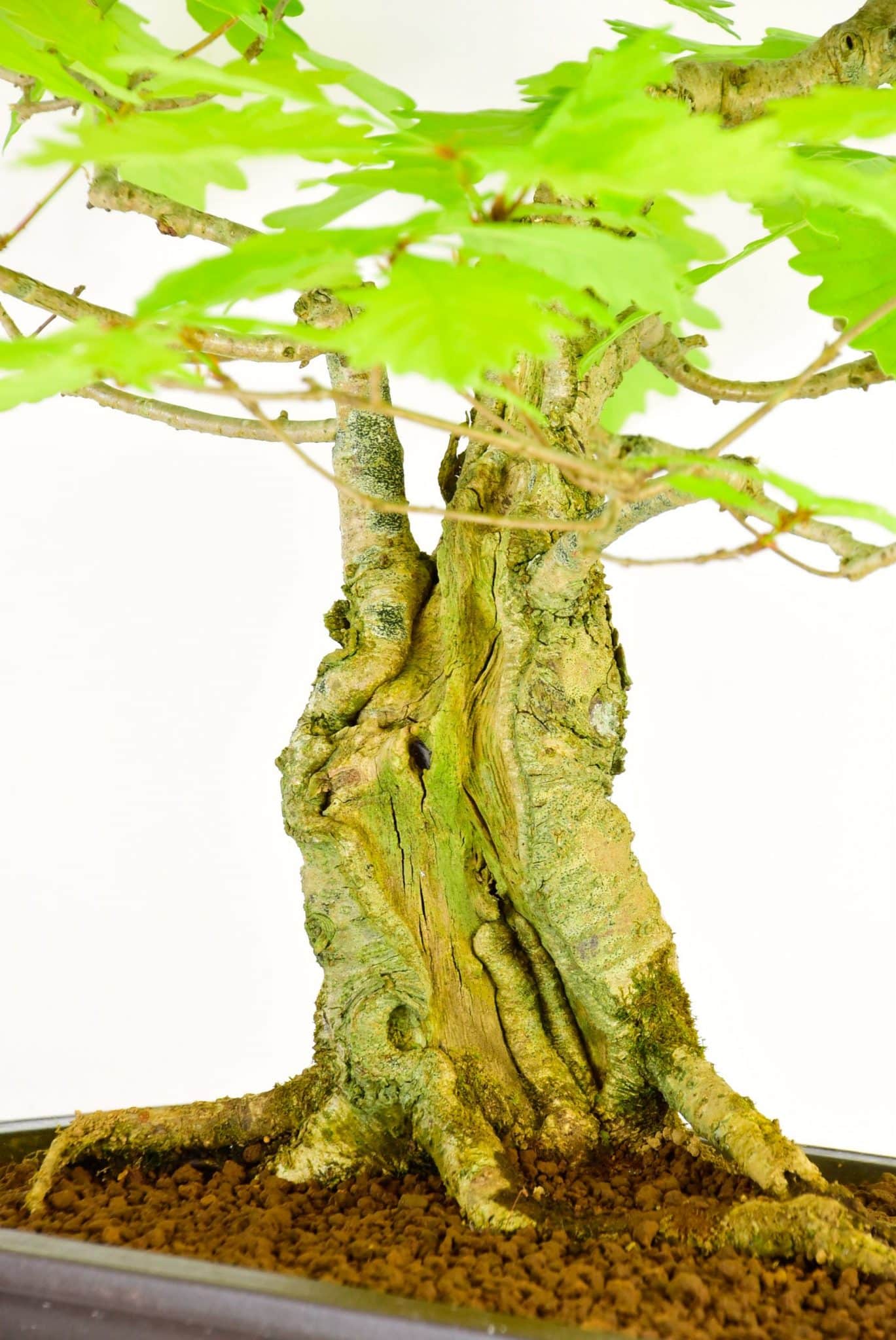 An outstanding English Oak (Quercus robur) bonsai with beautiful lobbed leaves, powerful trunk and stature, feature hollowed and gnarled character trunk and fabulous root flare.