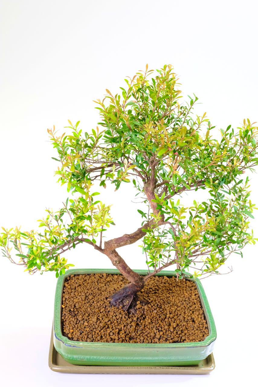 This impressive 17-year-old Roseapple bonsai (Syzygium buxifolium) showcases a wonderfully free-flowing, serpentine design that feels light, open and beautifully expressive. Its branches spread gracefully, creating an airy structure that looks elegant from every angle. Holly has chosen a gorgeous mottled green ceramic pot for this tree, paired with a subtly deeper olive-toned drip tray — together they highlight every shade in the foliage and bring the entire composition to life.