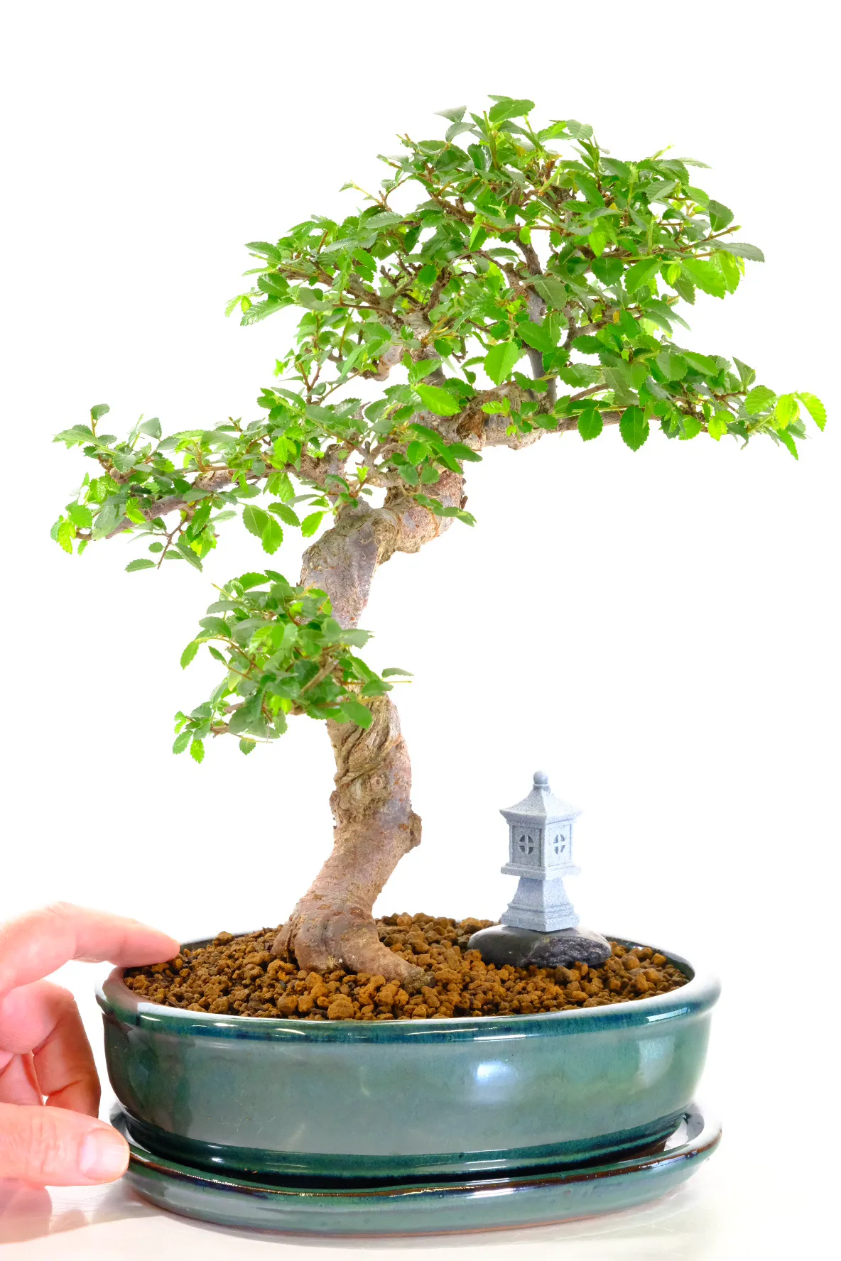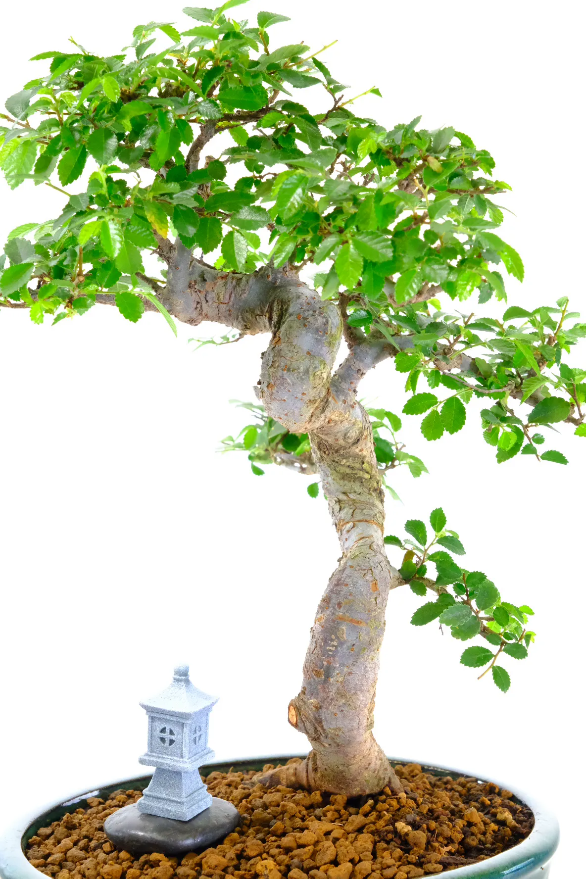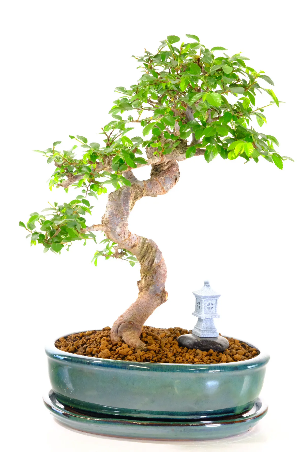 A beautifully shaped Chinese Elm beginners bonsai (Ulmus parvifolia) featuring a flowing serpentine trunk, striking curves, and vibrant green foliage. Planted in a brand new forest green bonsai pot with a matching drip tray, this easy-care bonsai is perfect for beginners and makes a thoughtful, long-lasting gift. I love the sinuous twists and strong powerful design. A small oriental temple adds scale and interest to the composition.