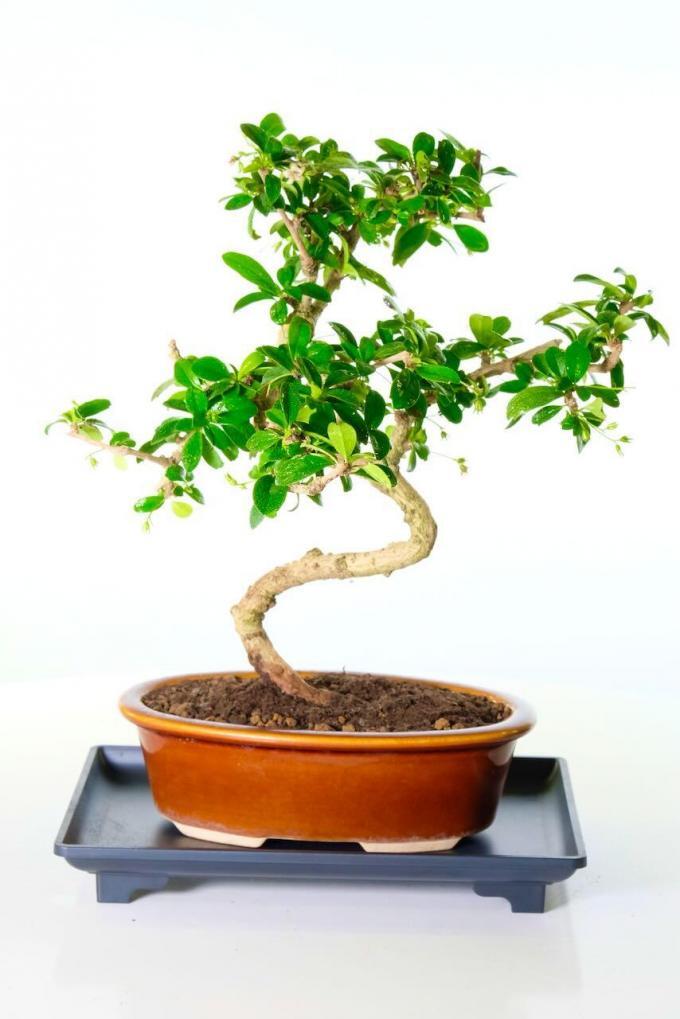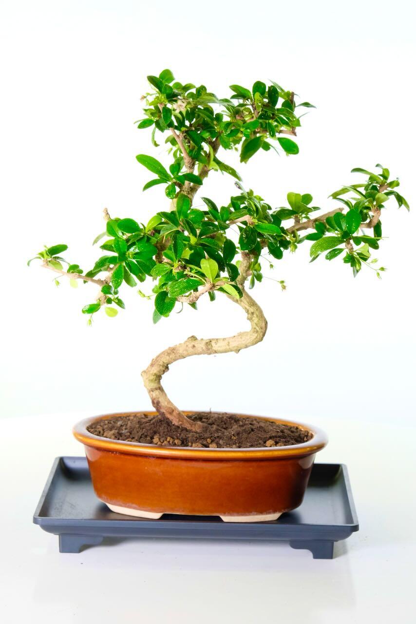 Explore the world of bonsai with our Fukien Tea Tree (Carmona microphylla). This bonsai boasts a striking, interestingly shaped trunk, creating a captivating and unique appearance. Its glossy leaves transition from bright to dark green whilst harmoniously wrapping around the branches.