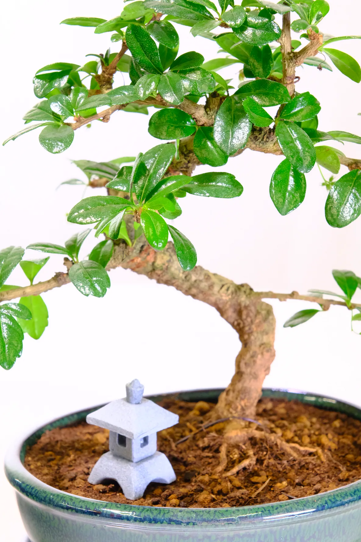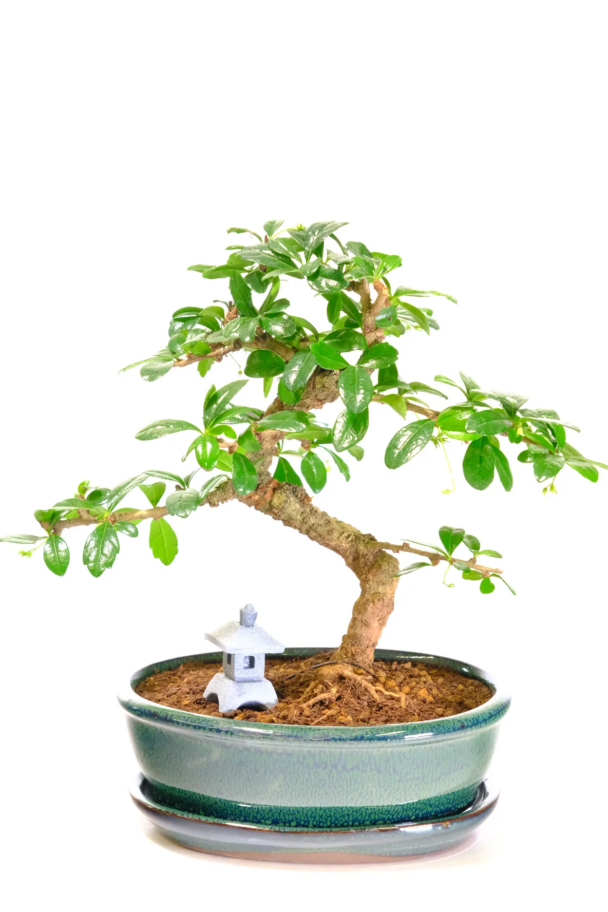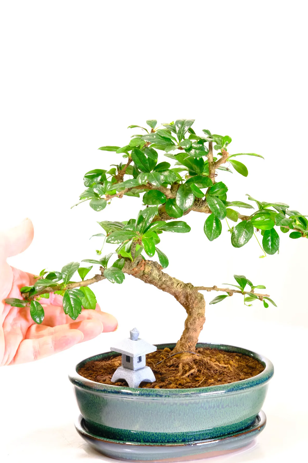 This is a beautiful flowering Tea Tree bonsai with artistic style and gnarly character. The Oriental Tea Tree Bonsai is a favourite amongst bonsai enthusiast with its luscious green leaves and delicate summertime white flowers. This bonsai tree has an elegant shaped trunk with wonderful accentuated curves, as well as lovely foliage. It comes in a forest green ceramic bonsai pot, with a matching ceramic drip tray. The natural colouring of the pot highlights the glossy green foliage and white summer flowers beautifully. Also include is a miniature Japanese lantern.