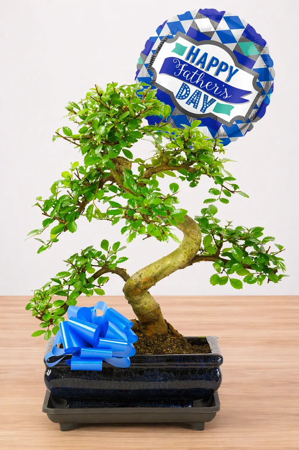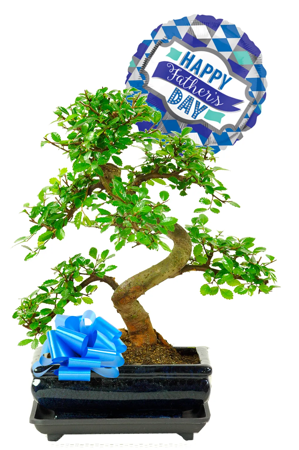 This Father’s Day, surprise your dad with a gift that combines elegance, symbolism, and a touch of nature’s beauty. Our stunning twisty Chinese Elm bonsai is the perfect way to show your love and appreciation. This unique gift is designed for fathers who cherish the serenity of nature and is especially recommended for beginners, ensuring that your dad can enjoy it without fuss. This is an evergreen variety when grown inside, with small glossy leaves. It is tastefully potted into a blue ceramic pot and is supplied with a blue ‘Happy Father’s Day’ foil balloon, adding a cheerful touch to your heartfelt present. The gift includes free basic-care instruction guide, ensuring your dad can effortlessly enjoy and care for his new bonsai. Plus, you can make it even more special by adding a personalised message, a hanging tag, or gift wrapping.