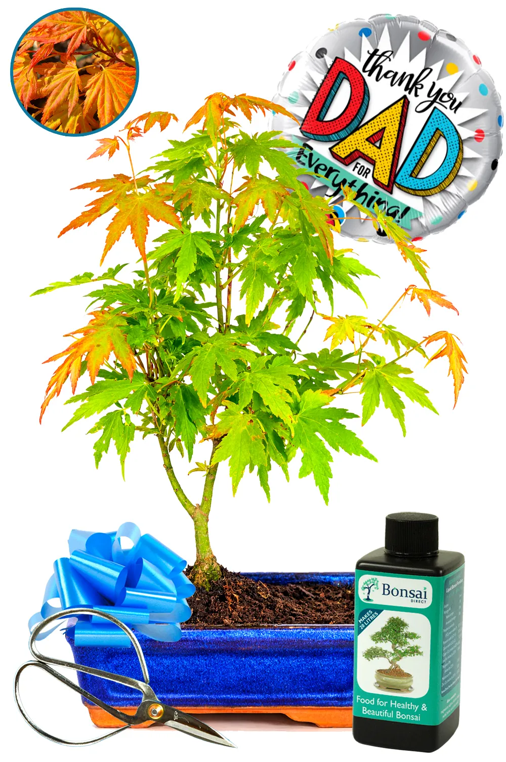 The Father’s Day Orange Dream Maple Bonsai Starter Kit is a truly special gift idea for Father’s Day, combining elegance, colour, and thoughtfulness. The Orange Dream Maple bonsai starter kit features a captivating Japanese Acer palmatum bonsai with vibrant colours of oranges, gold, lime, and green. Its elegance and graceful trunk radiate peace, serenity, strength, and love. The kit includes the deciduous bonsai planted in a traditional blue ceramic pot, small pruning scissors and a bottle of bonsai feed, making it a perfect gift for your special Dad. With FREE delivery and a care guide included, nurturing the bonsai becomes effortless, making it ideal for beginners. Complete with a heartfelt air-filled foil balloon that says, “Thank you Dad for everything you do,” this kit is more than just a gift—it’s a gesture of appreciation.