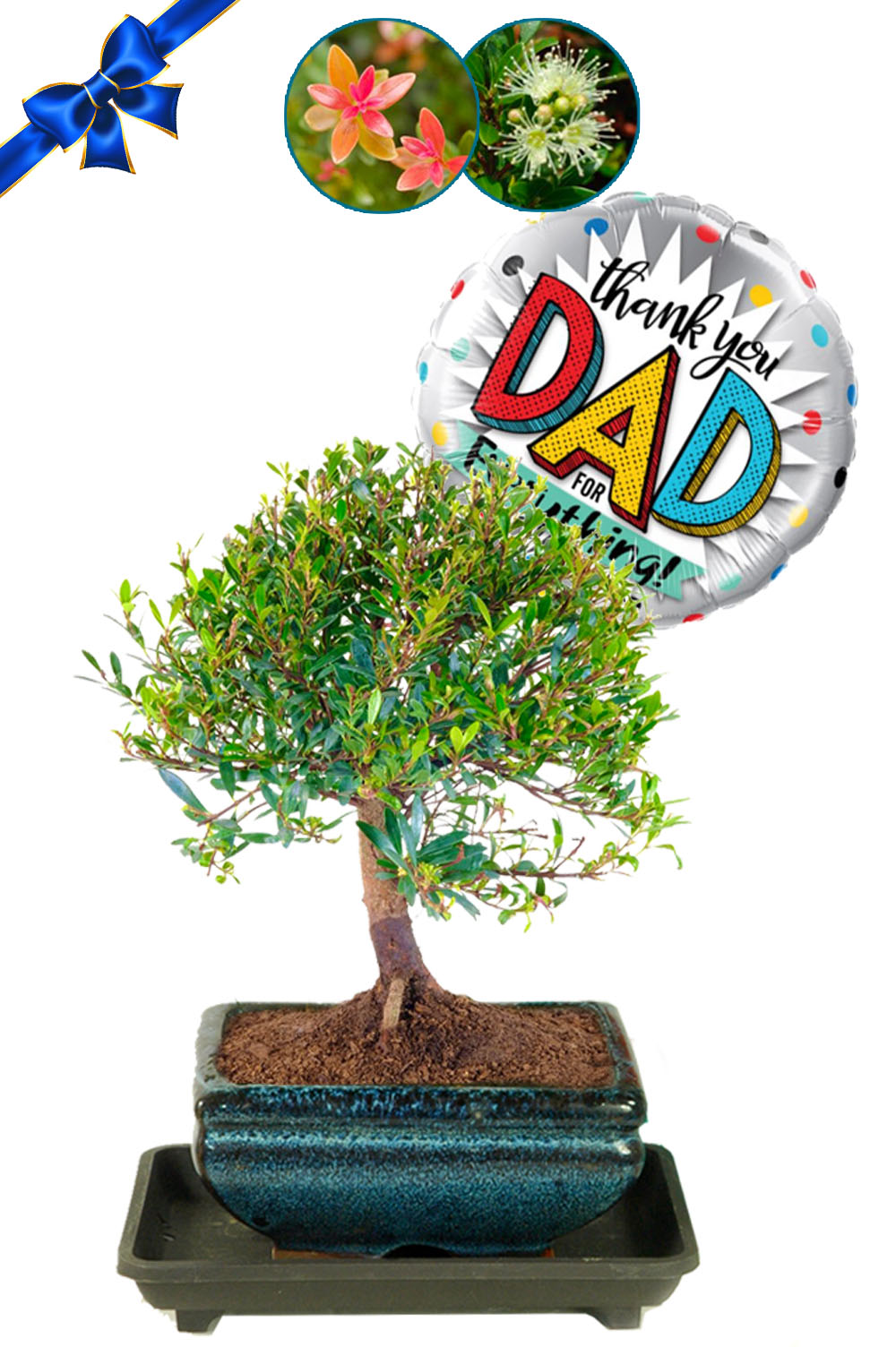 Make this Father’s Day unforgettable with the incredible Myrtle, a captivating Syzygium buxifolium, also known as Roseapple, indoor bonsai. This fruiting and flowering bonsai showcases an enchanting orchard-style design, accentuated by its beautiful features and red-toned bark. Add a touch of sentiment with the “Thank you Dad for everything” Father’s Day Balloon, making it an extraordinary gift.