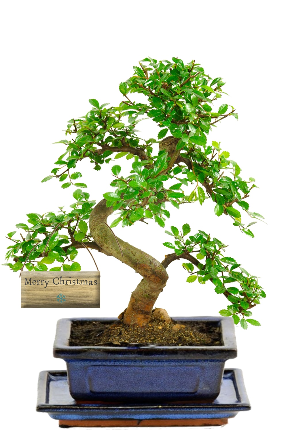 Presented in a traditional blue ceramic pot with a matching dark drip tray, this Christmas bonsai arrives ready to display. The festive wooden “Merry Christmas” snowflake tag adds a seasonal touch, turning this tree into a thoughtful and heartfelt gift.