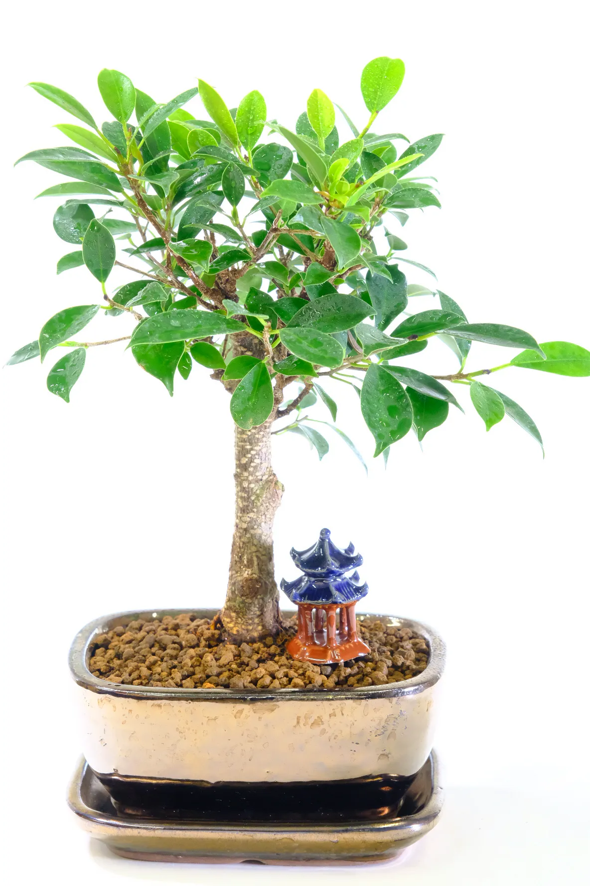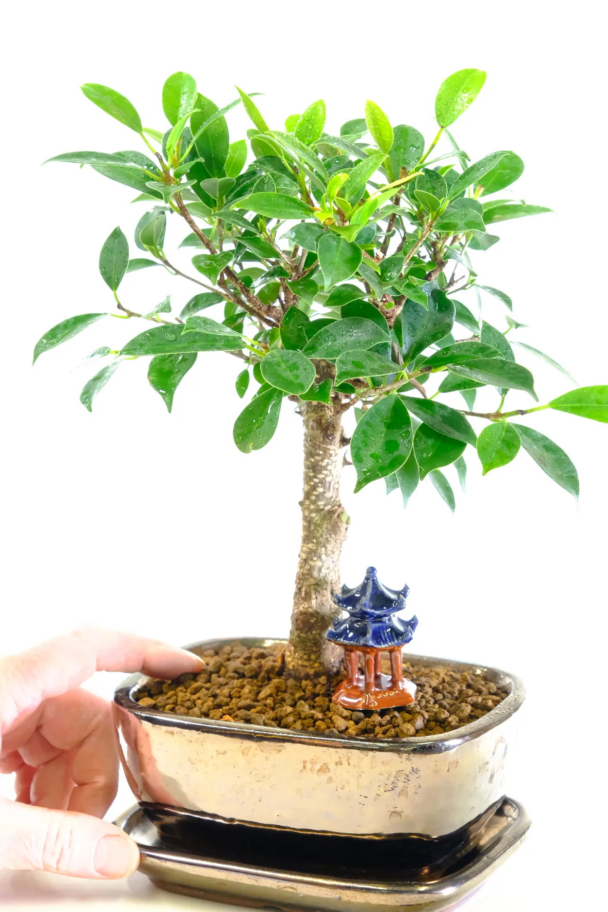 This miniature yet powerful 9-year-old Ficus retusa bonsai stands just 29cm in height, yet it carries the presence of a much larger tree. Styled in an elegant informal upright form, it features a bold, characterful trunk with silvery bark striations and a lush canopy of glossy emerald-green leaves bursting with buds. Potted in a contemporary black-gold metallic finished ceramic pot with matching drip tray, this dwarf indoor bonsai blends strength with refinement. Easy to care for and ideal for beginners, the Ficus retusa symbolises health, longevity and harmony — a compact yet commanding tree designed to bring year-round beauty into any bright indoor space. We have paired this bonsai with a small oriental temple to complete the composition.
