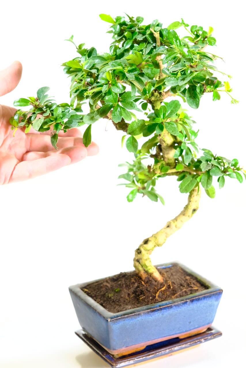 Introducing our wonderful flourishing flowering Fukien Tea Tree bonsai with highly artistic style and immense character. This variety of bonsai is a favourite amongst enthusiasts with its glossy green leaves and dainty white flowers during the summertime. Our striking bonsai tree has a gently curving trunk, standing in an informal-upright position with lovely bark texture trunk features. Additionally, this bonsai has brilliant branch placement which forms a captivating canopy of rich glossy leaves. Expect some seasonal variation as the tree will grow delicate white flowers during summer months. The variety itself, known also by its Latin name the ‘Carmona microphylla’, radiates courage and it is often given as a gift to show a declaration of love. Making it easy to match any interior space, it comes potted in a navy blue rectangular ceramic bonsai pot, with a matching ceramic drip tray.