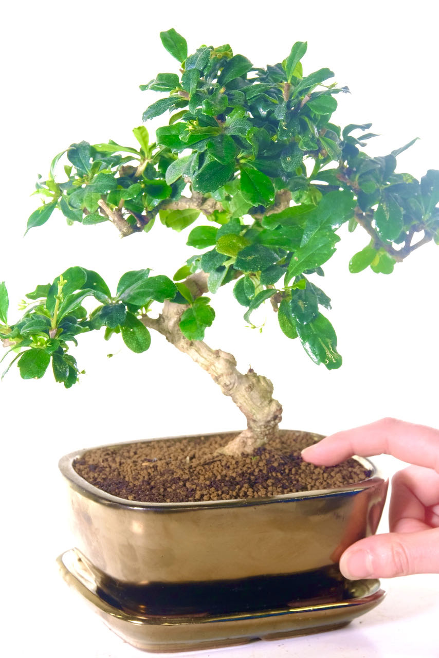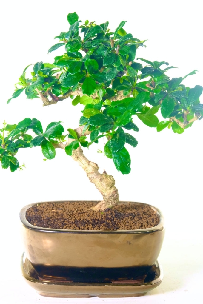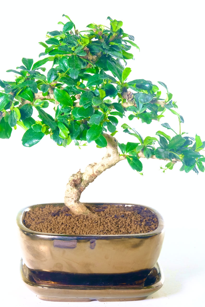 This highly popular flowering indoor bonsai variety showcases a distinctive leaf shape, elegantly potted in a metallic gold ceramic bonsai pot with a matching drip tray. Each Premium bonsai is individually photographed, allowing you to select this exact bonsai.