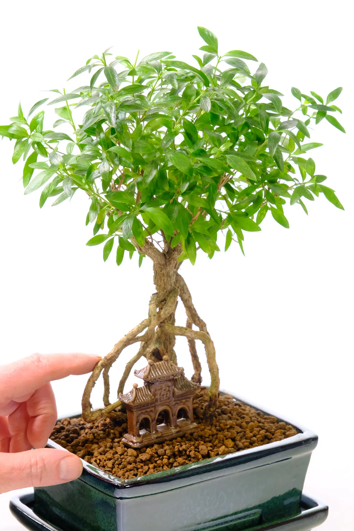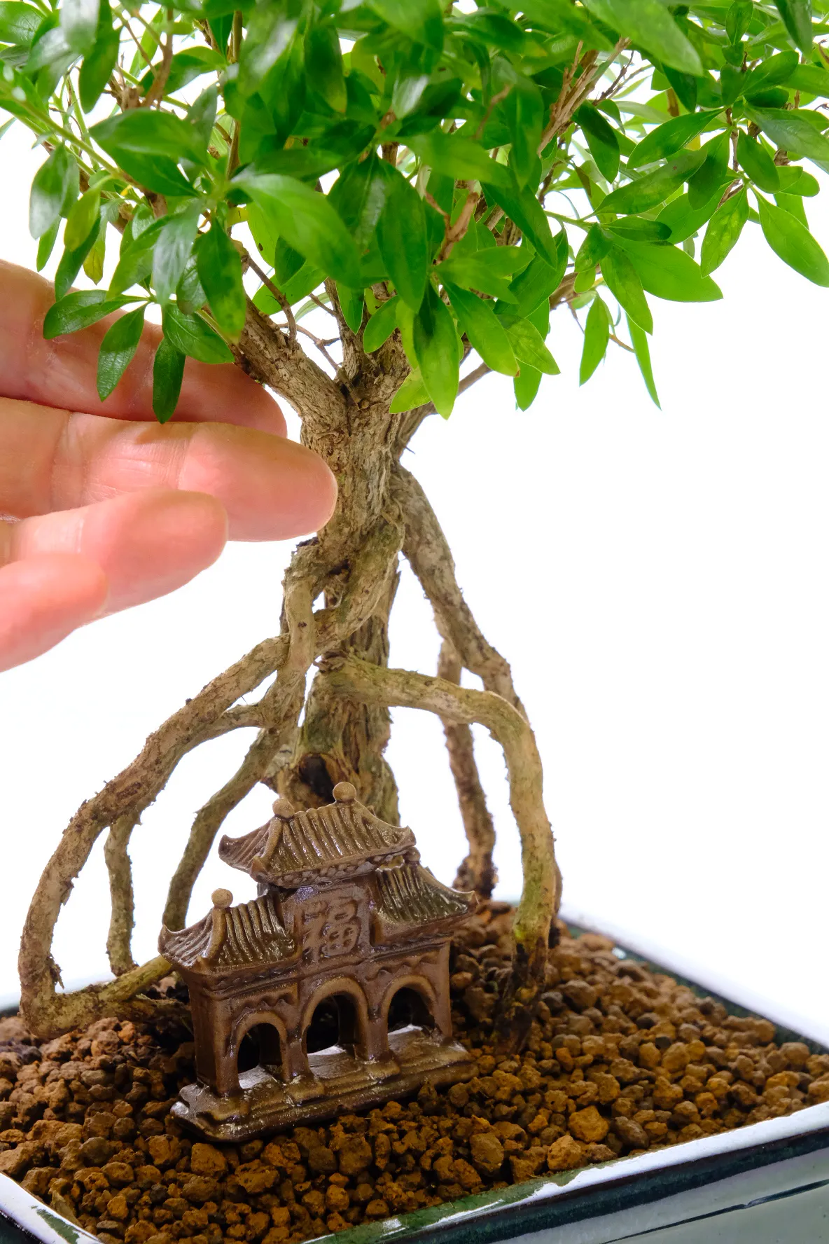 Potted in a stylish forest-green ceramic pot with a matching drip tray, this Serissa displays elegant contrast. The soft pot colour enhances the vivid green leaves and highlights the flowing lines of the root and trunk structure. Its canopy is naturally neat and full, with tiny, well-proportioned leaves that give this bonsai a polished and tidy silhouette. You will also receive the small temple ornament.