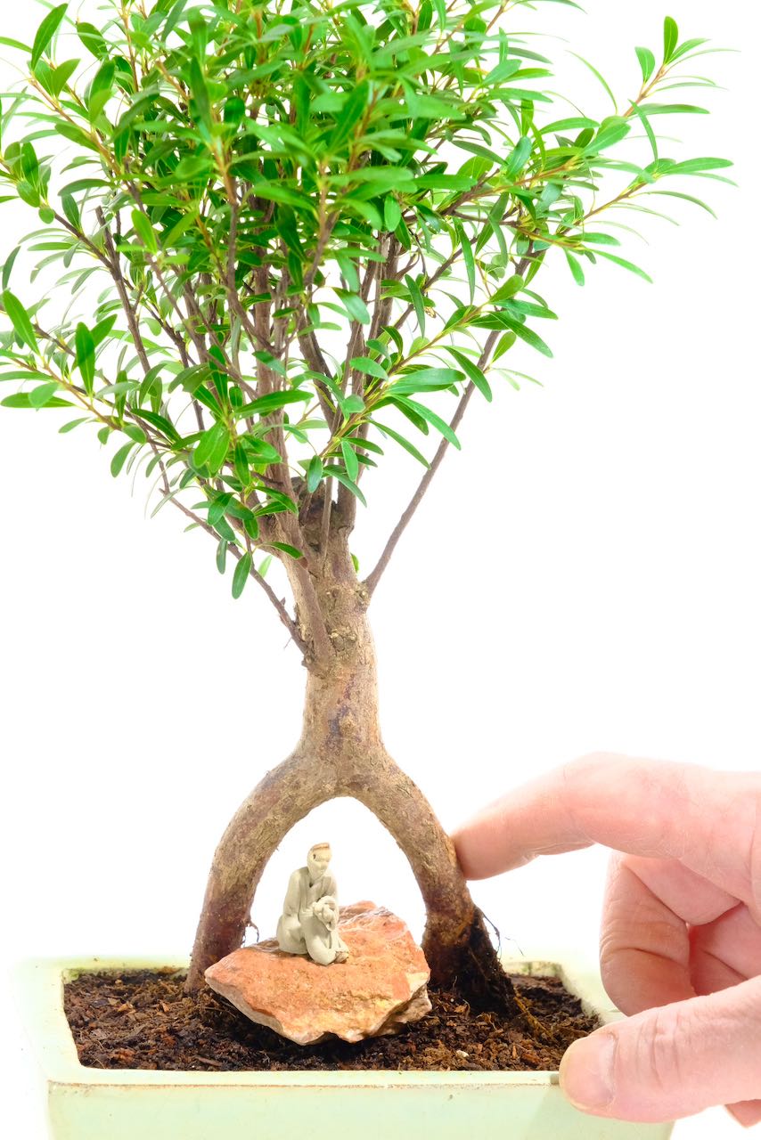 A meticulously cultivated Syzygium buxifolium (Myrtle/Roseapple) bonsai showcasing an expressive trunk and phenomenal forked roots. Fruits in autumn and blooms with ivory flowers in summer, featuring red-toned, textured bark and a full, colourful canopy – so pretty! Presented in a cream rectangular ceramic pot, offering both beauty and symbolic meaning—love, joy, good fortune, and long life. A beginner-friendly, gift-worthy bonsai; you receive the exact tree shown. On special offer as part of our festive bonsai tree sale. A small figure sits on a rock beneath the branches.